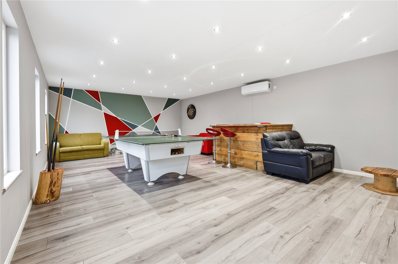 UPVC double glazed French doors to front. Three double glazed windows to front. Wall mounted air conditioning unit. Wood effect laminate flooring throughout. Smooth plastered ceiling with recessed LED lighting. This large and diverse space is perfect for games room/cinema room with separate consumer unit. Fitted LED downlighters to soffits.