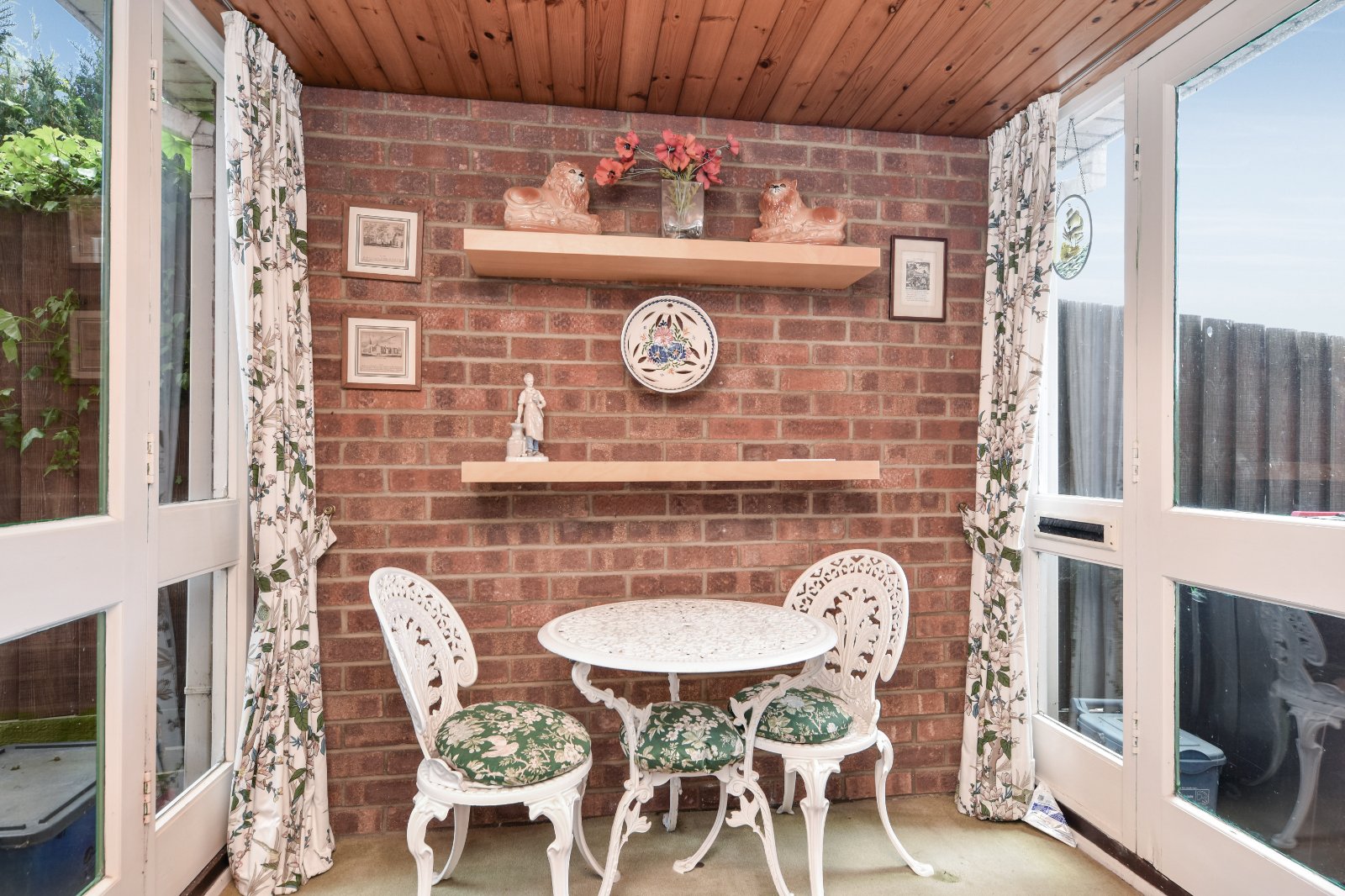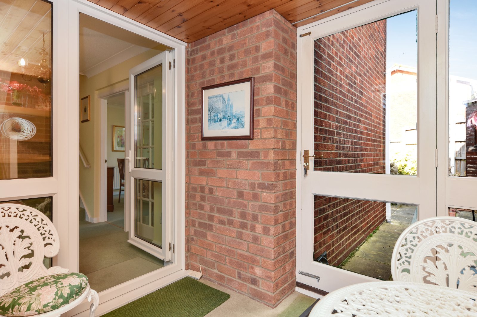 Matching timber-framed door with glazed inserts and accompanying side panel provides access to the rear garden. Wood panelled ceiling. A further uPVC double glazed door with matching side panel leads through to: