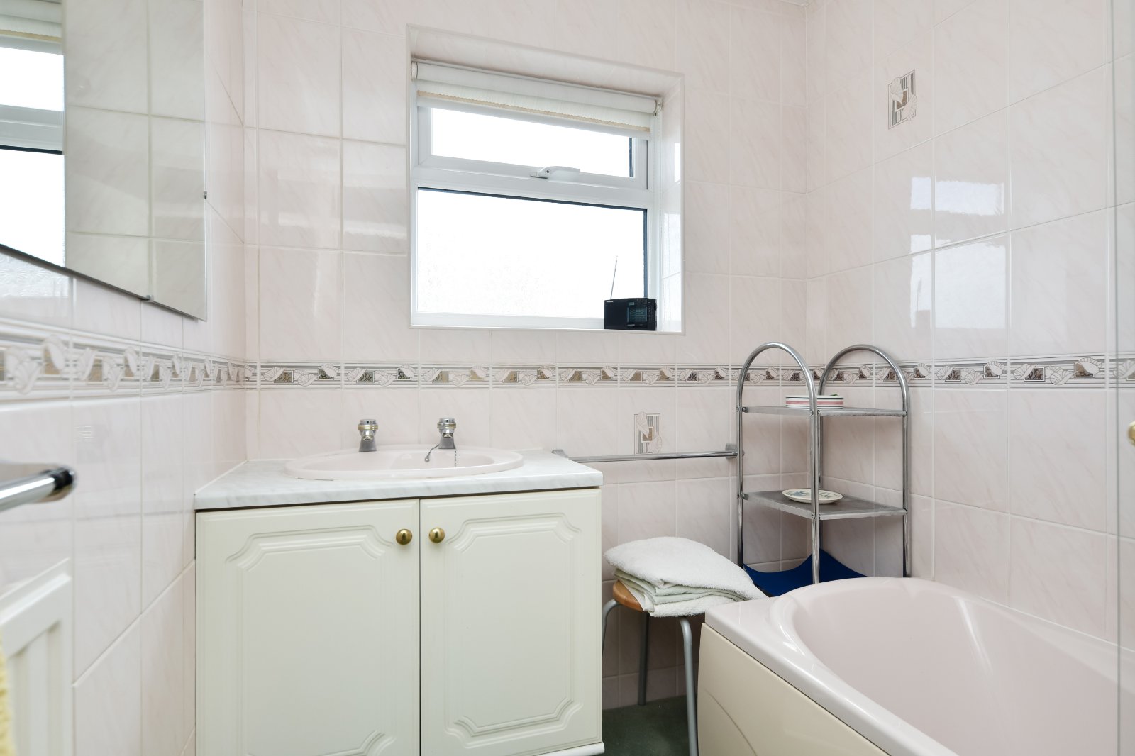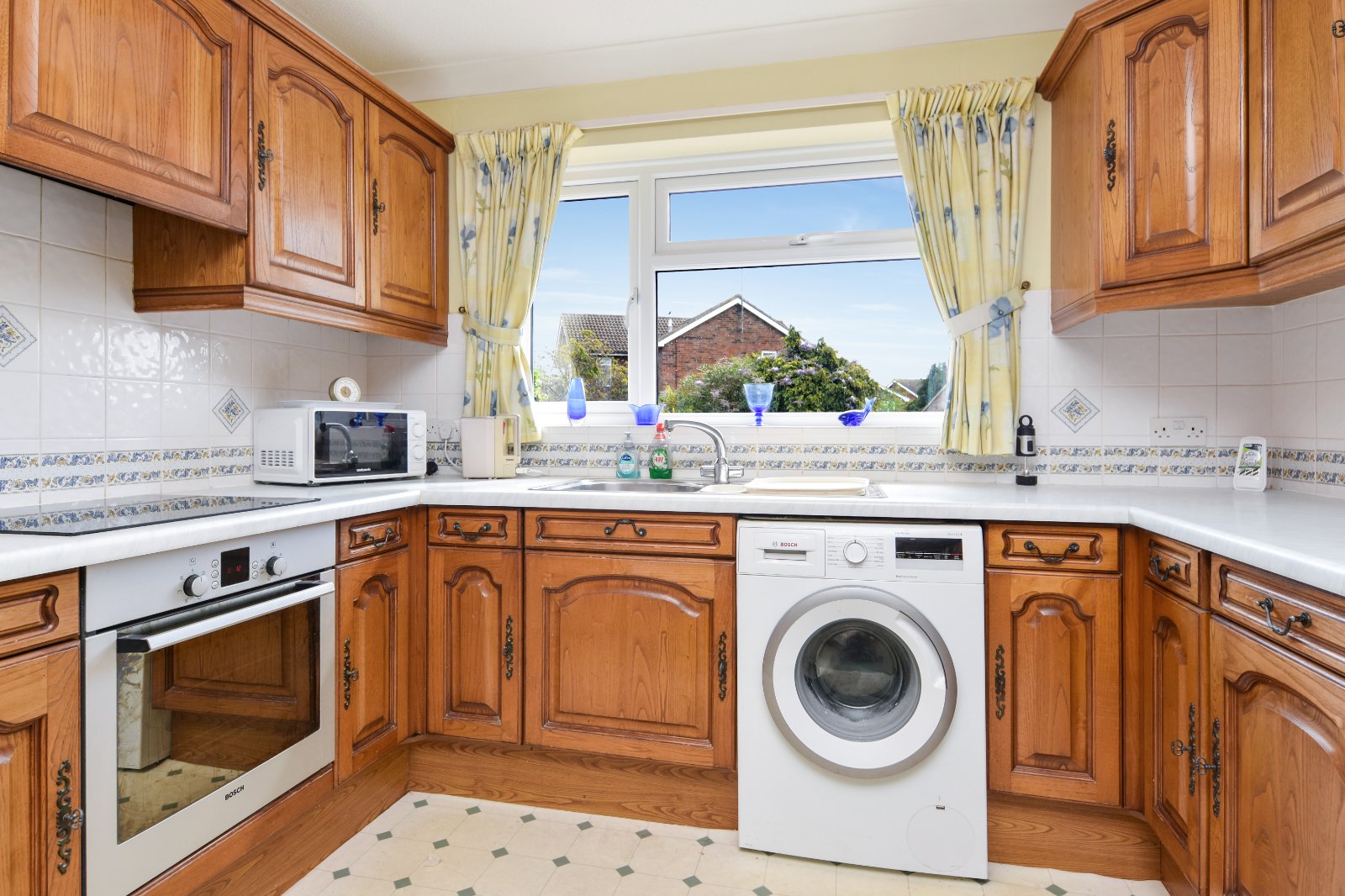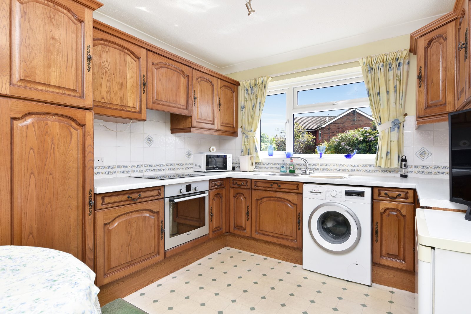 uPVC double glazed window to rear aspect with a further uPVC double glazed window to the side, providing good natural light. Fitted with a comprehensive range of eye and base level units with rolled edge work surfaces over, inset with a stainless steel one-and-a-quarter bowl sink unit with single drainer and mixer tap. Built-in eye level ‘Bosch’ oven with separate four ring electric hob and concealed extractor above. Under counter ‘Bosch’ washing machine and freestanding ‘Bosch’ fridge to remain. Tiled splashbacks with decorative border. Radiator. Coving to textured ceiling.