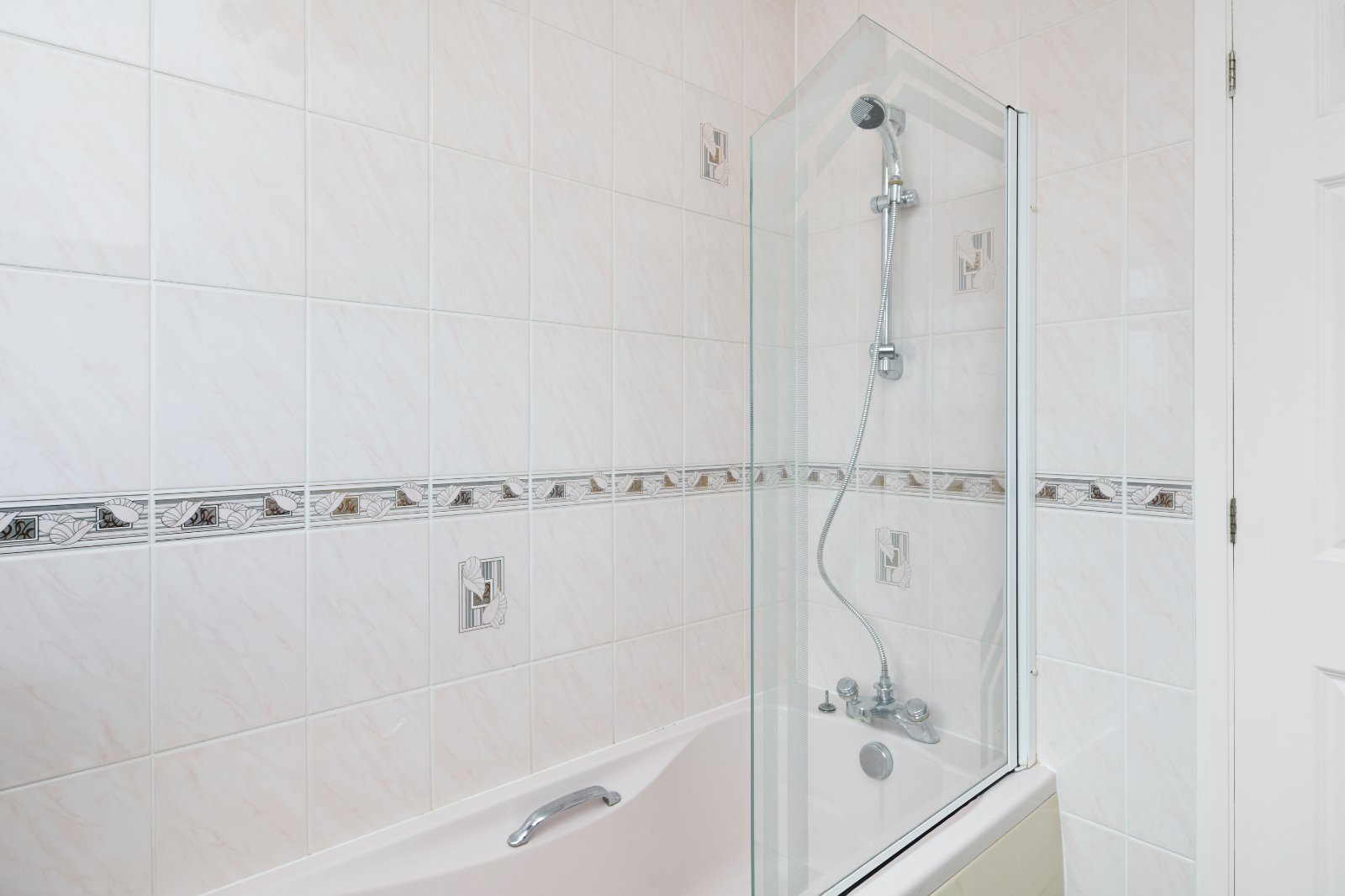 Obscure uPVC double glazed window to side aspect. Suite comprising a panelled enclosed bath with mixer tap and shower attachment, fitted glass shower screen, and a vanity wash hand basin inset into a storage cabinet with cupboards beneath. Tiling to all visible walls with decorative border tile inlay. Wall mounted mirror. Radiator. Textured ceiling.