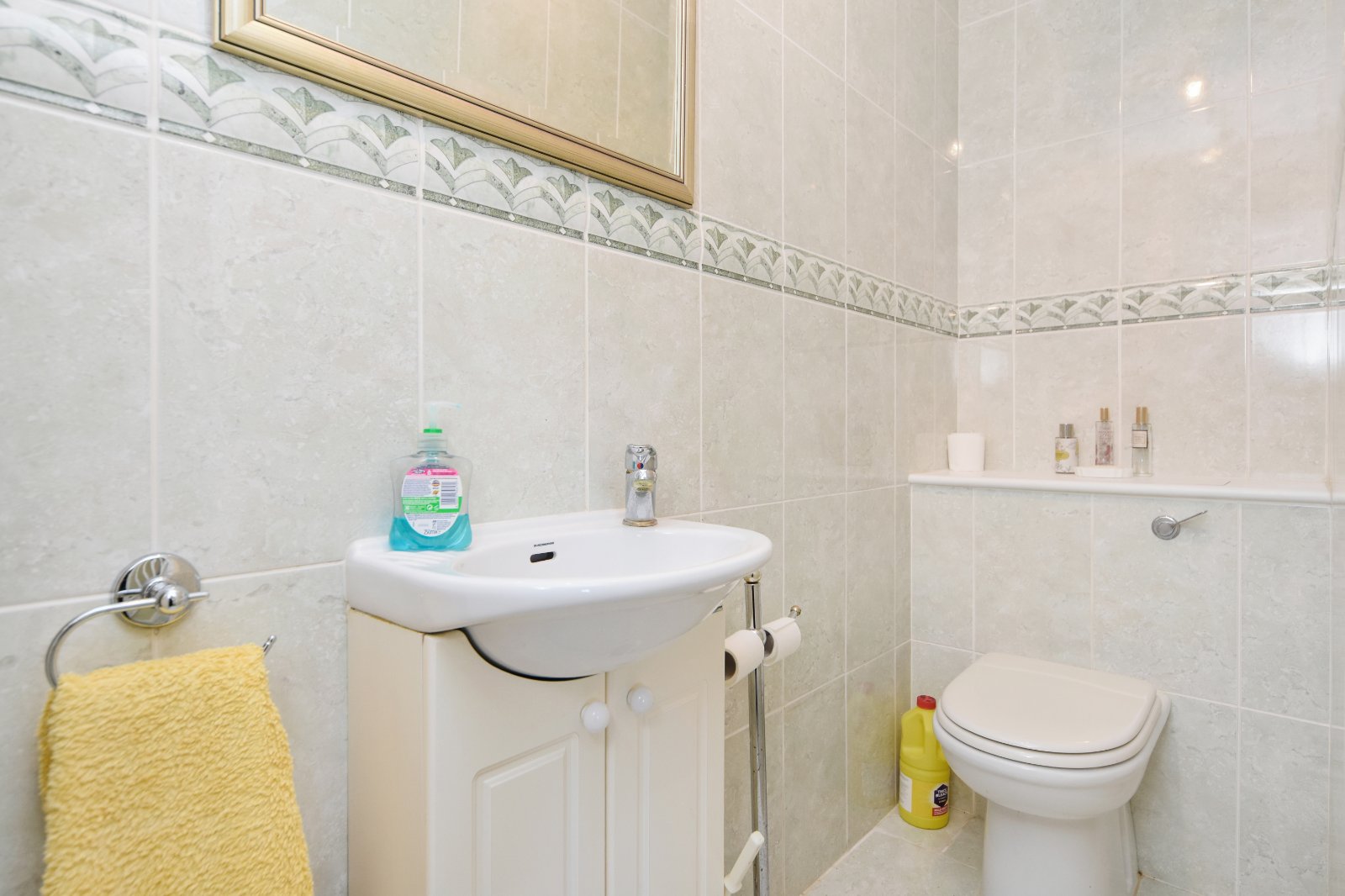 The white suite comprises a wall mounted wash hand basin with storage cupboard beneath and a concealed cistern low level W.C. with recessed display shelf above. Tiling to all visible walls inset with a decorative border tile inlay, complemented by tiled flooring. Textured ceiling.