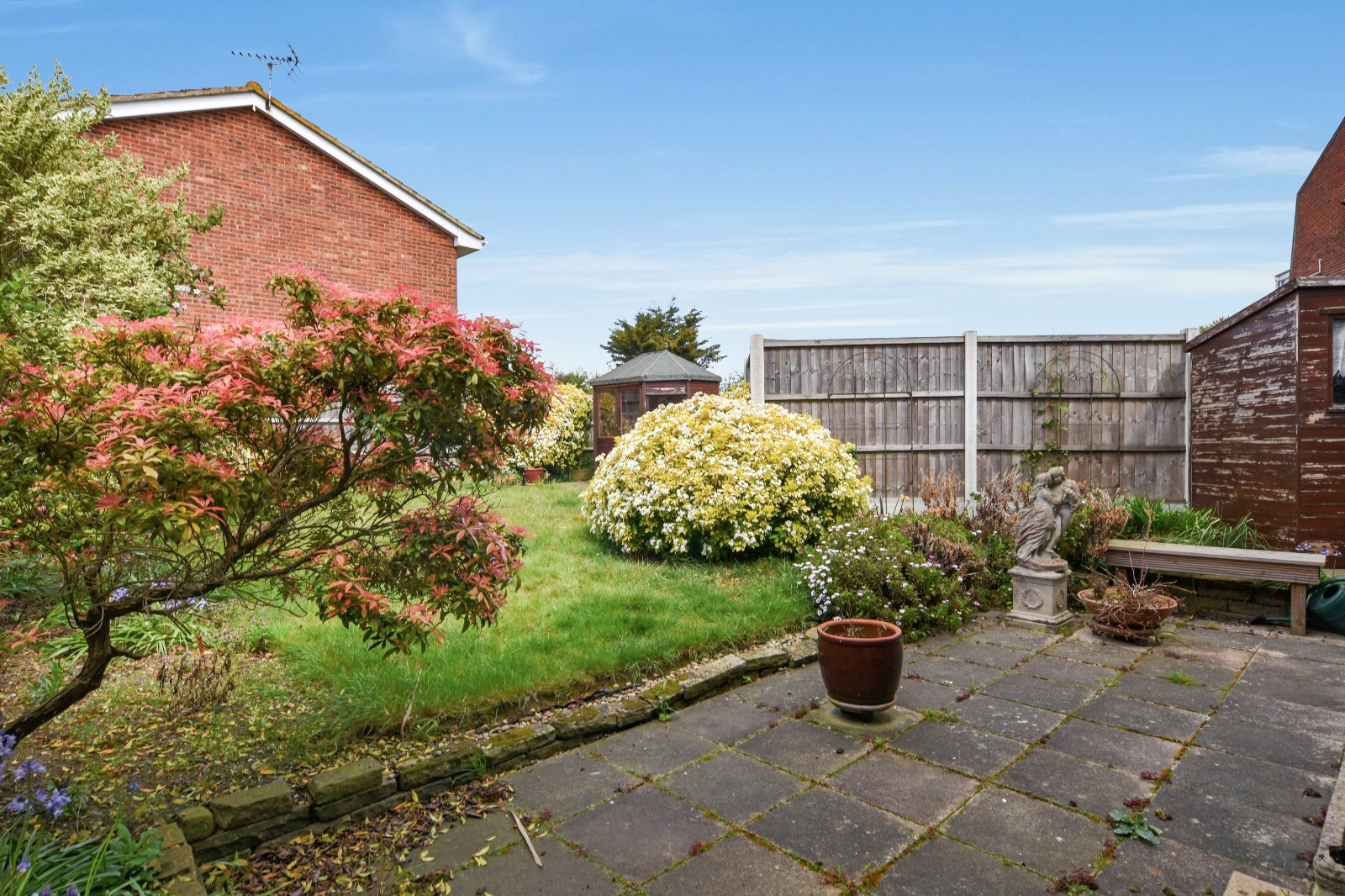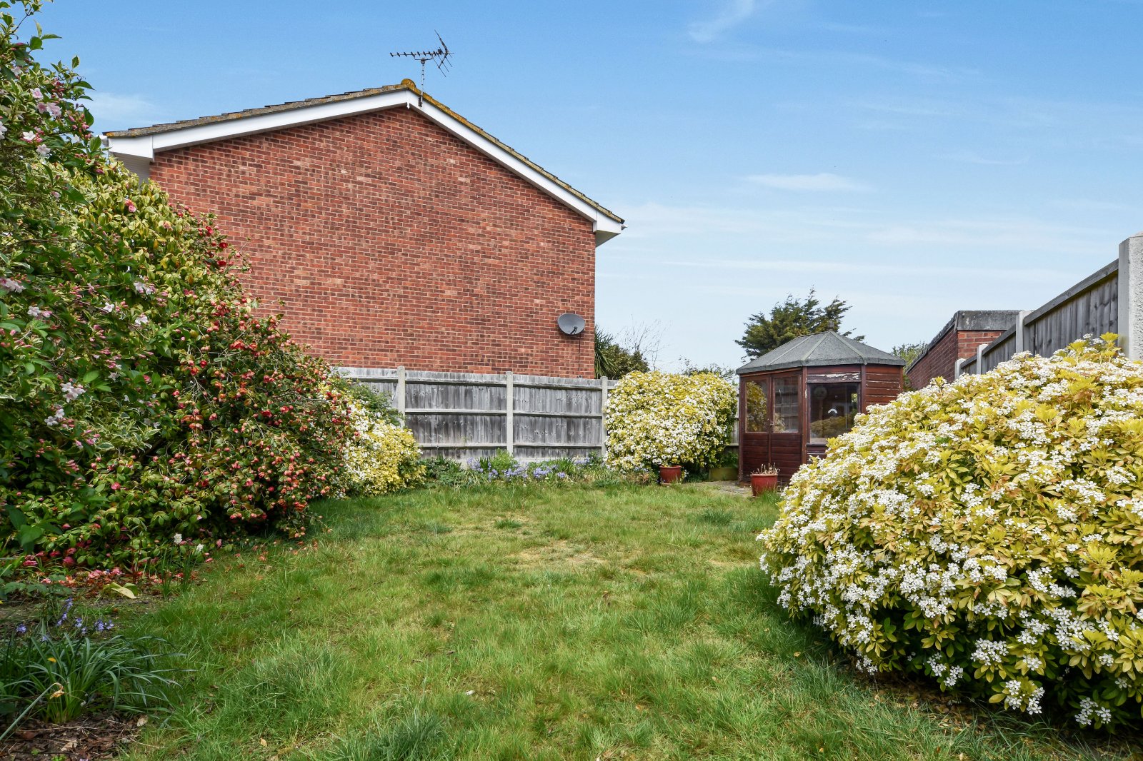 The rear Garden is approached via the Living Room and Entrance Porchway. The Garden commences with a patio seating area and gated side access to the front of the property. The remainder is laid predominantly to lawn and is complemented by established planted borders and fencing to boundaries. Outside garden shed and a shaped Summer House to remain. The Garden is of an irregular shape, offering a generous outside space. Outside water tap.