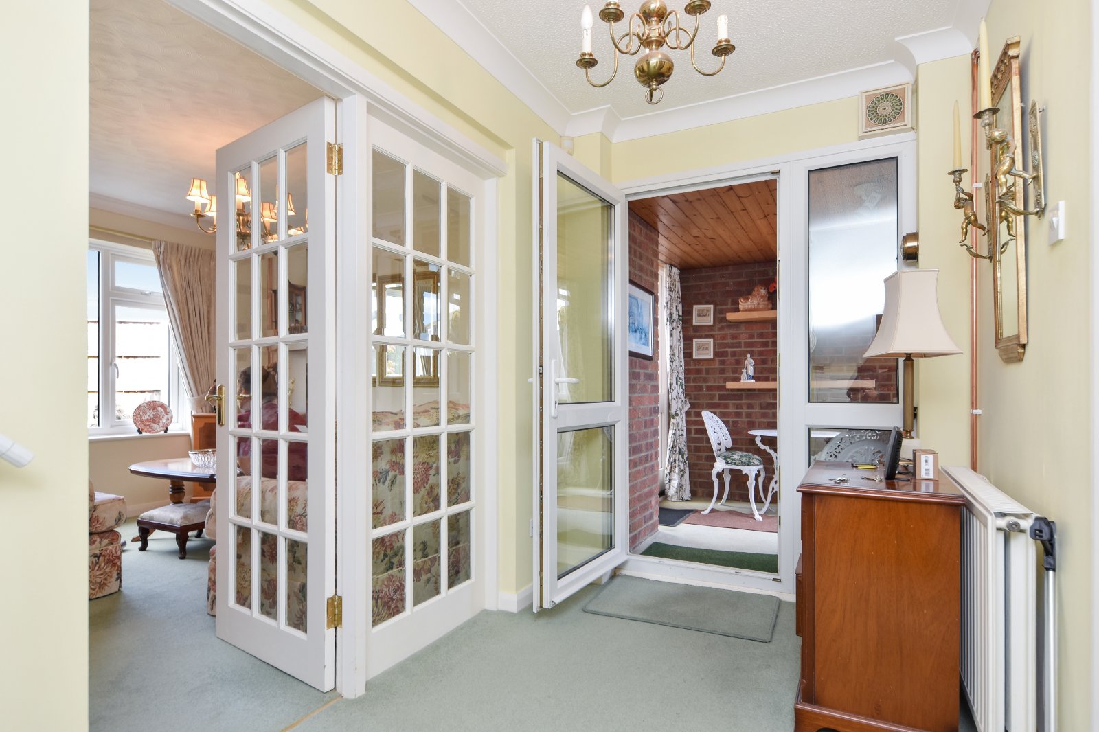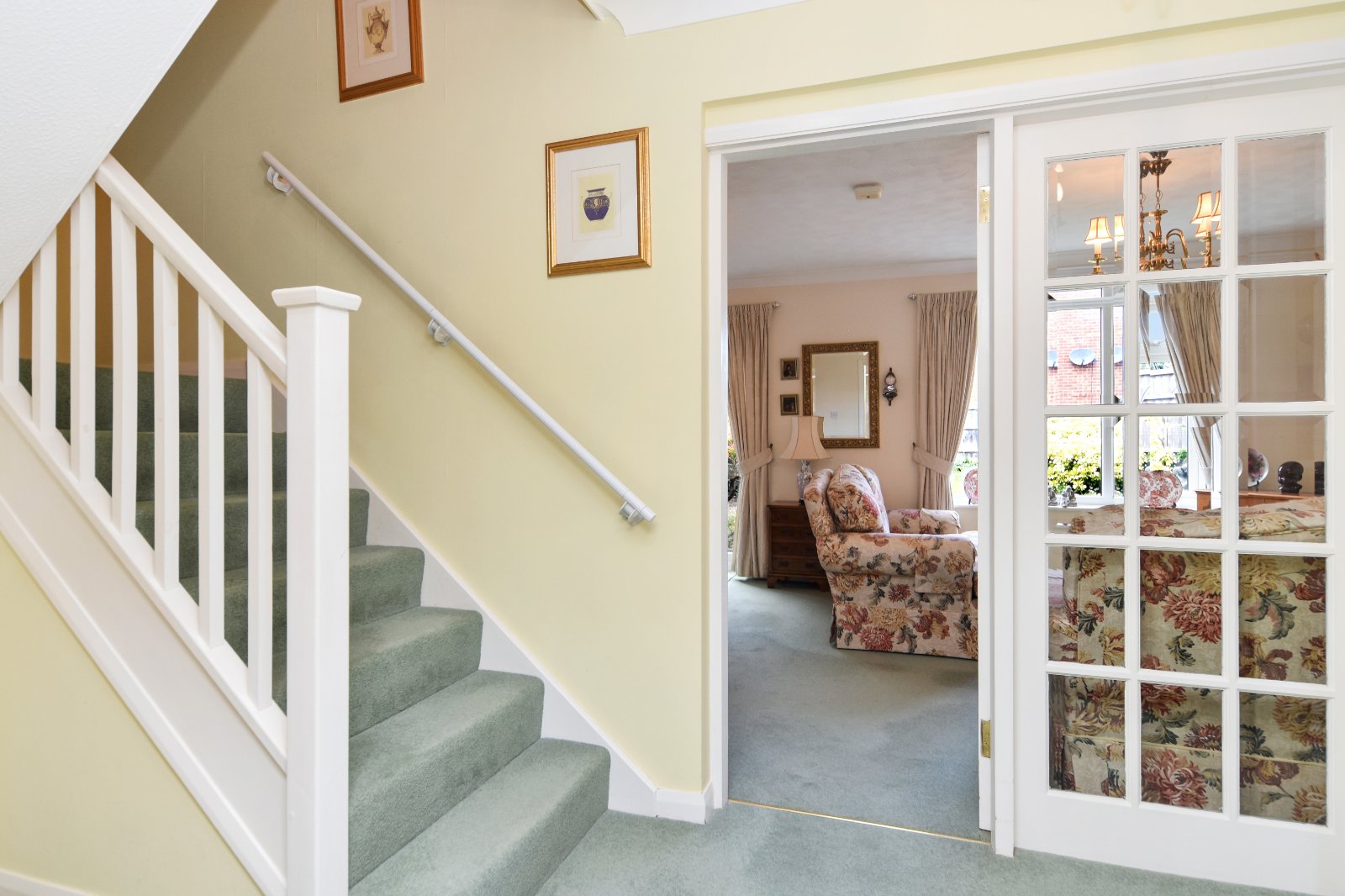 Spacious reception hall featuring a turned staircase rising to the first floor, with a half-height panelled door providing access to understairs storage. Attractive multi-pane, bevelled edge glazed double doors with matching side panel allow both access and natural light through to the Living Room. Panelled door to Guest Cloakroom/WC and a further matching glazed door to the Kitchen. Radiator. Coving to textured ceiling.