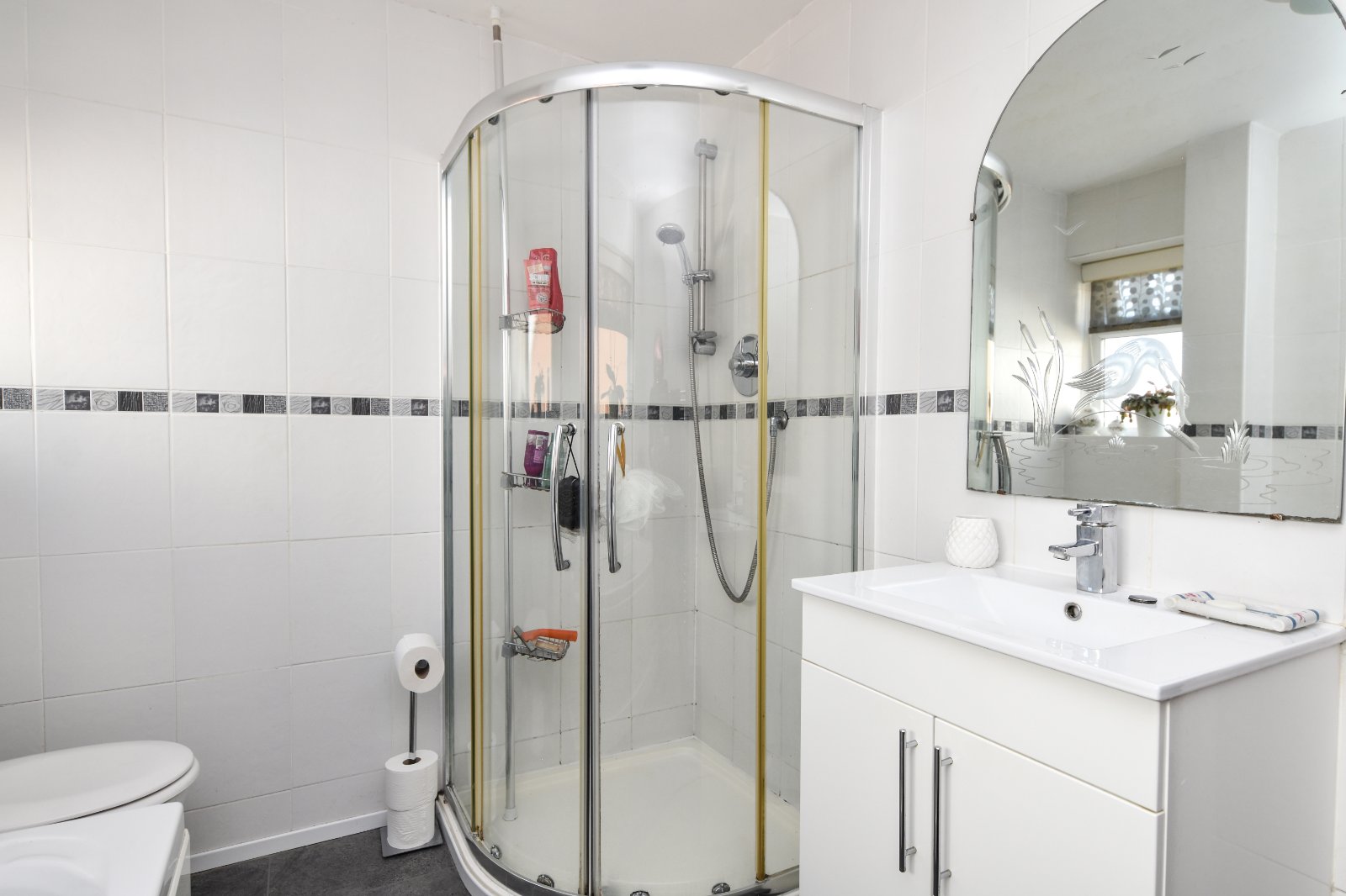 Pair of obscure uPVC double glazed windows to side aspect. The white four piece bathroom suite comprises a panelled enclosed bath with mixer tap, dual flush wc, vanity wash hand basin with storage cupboards under and independent shower enclosure with integrated shower unit. Tiled flooring. Ladder style heated towel rail. Tiling to all visible walls. Smooth plastered ceiling.