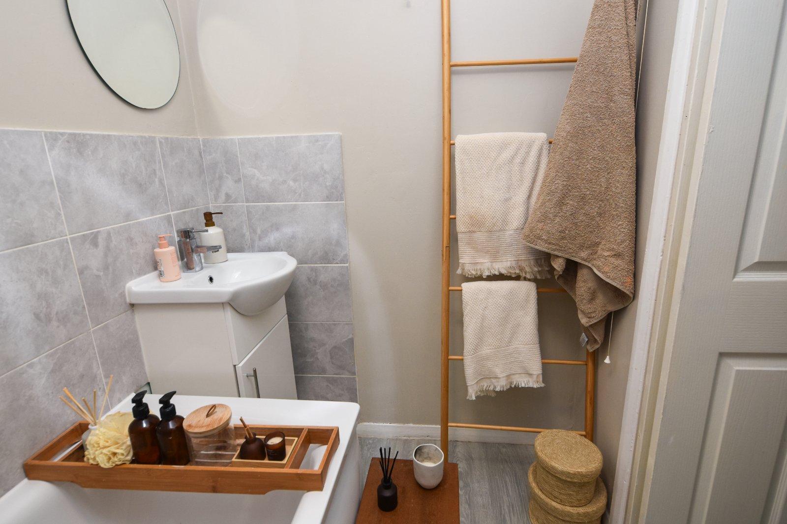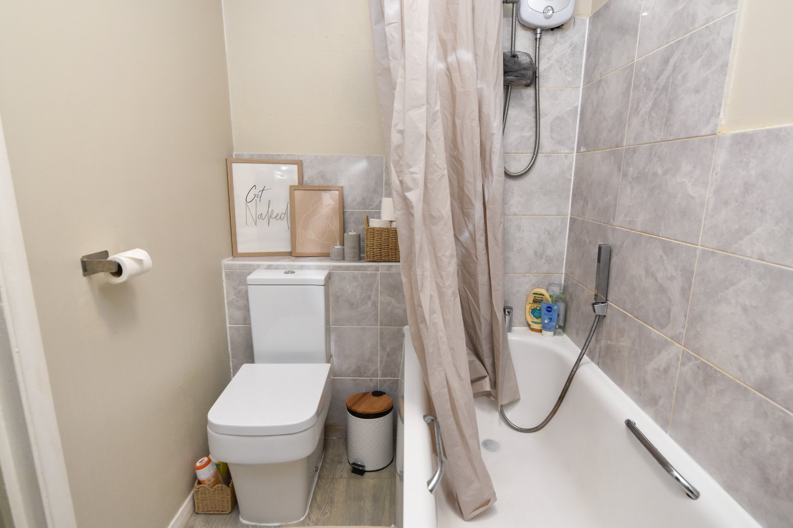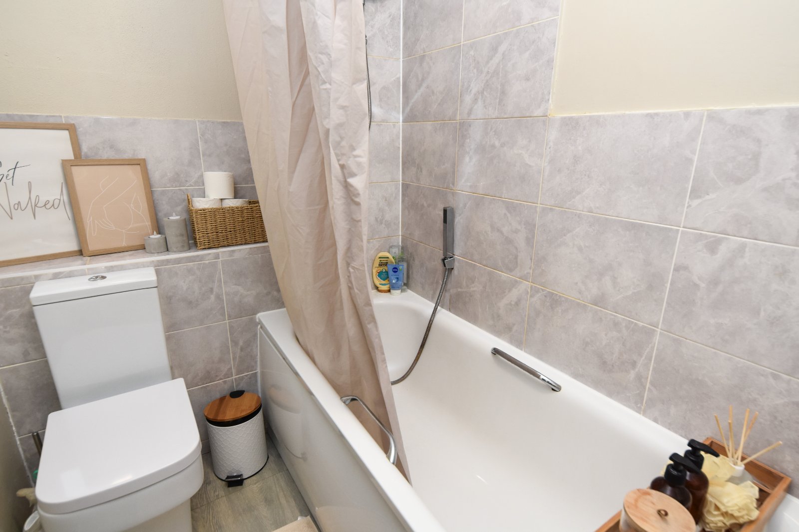 The three piece suite comprising of panelled enclosed bath with twin handgrips mixer taps and shower attachment over, dual flush w.c., and vanity wash hand basin with storage cupboard under. Partly tiled walls. Textured ceiling.