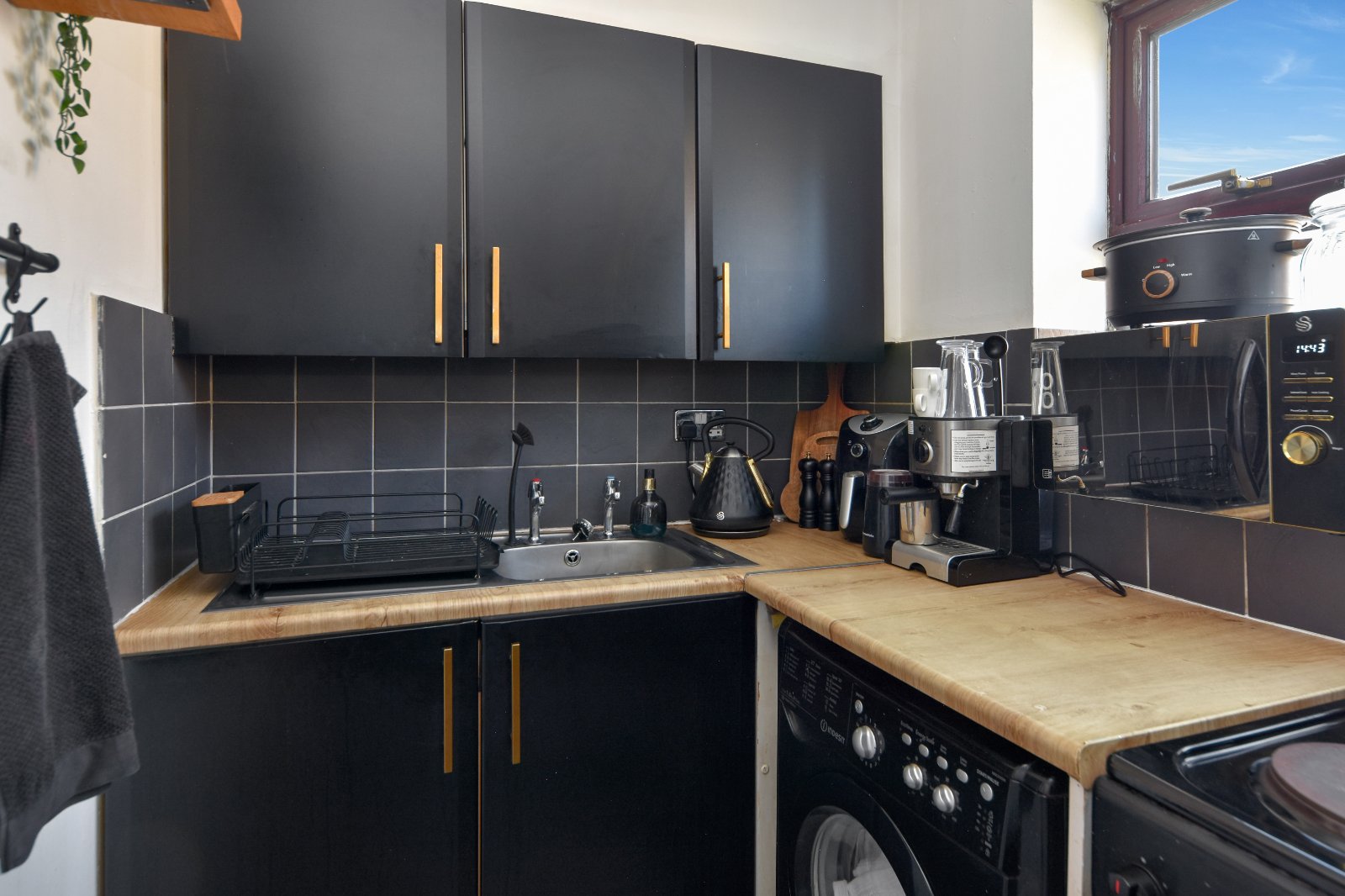 uPVC double glazed window to side aspect. The Kitchen comprises eye and base level units with worksurfaces over inset with single drainer sink unit. Space for under counter washing machine. Freestanding oven. Further appliance space. Tiled splash backs. Textured ceiling.