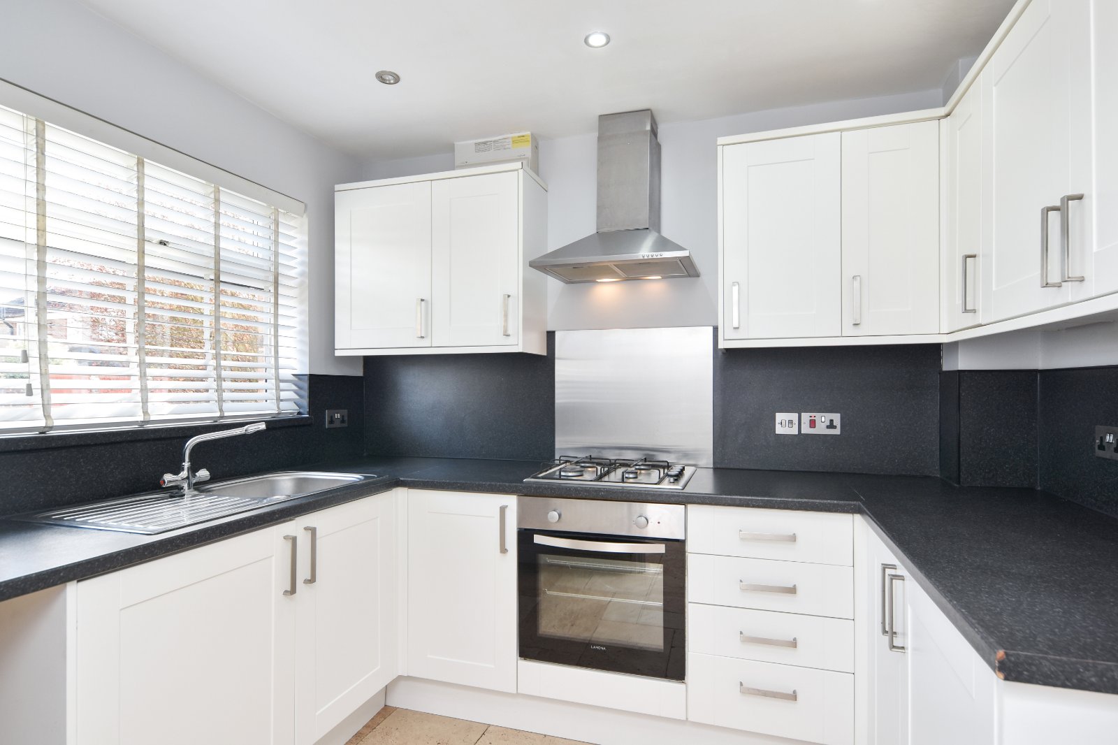 uPVC Double glazed window to front aspect. The Kitchen is fitted with a range of matching wall and base units, complemented by work surfaces and matching upstands inset with stainless steel sink and drainer with mixer tap over. Integrated appliances include 'Lamona' oven with four ring gas hob, stainless steel splashback and stainless steel extractor hood above. Under counter space for appliance. Further recess for upright fridge/freezer. Wall-mounted 'Ideal Classic' boiler. Durable stone-effect tiled finish. Radiator. Smooth plastered ceiling inset with recessed lighting.