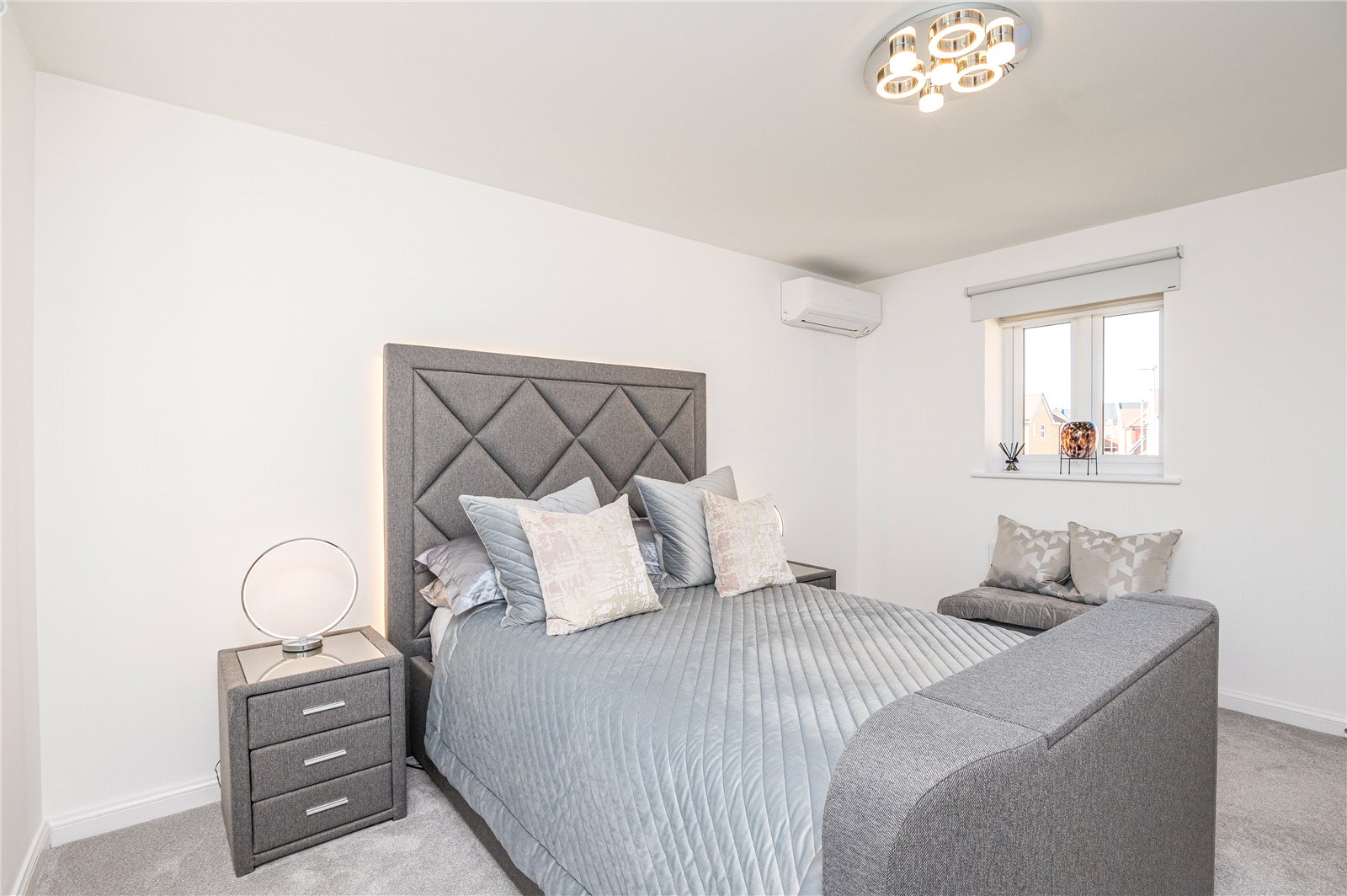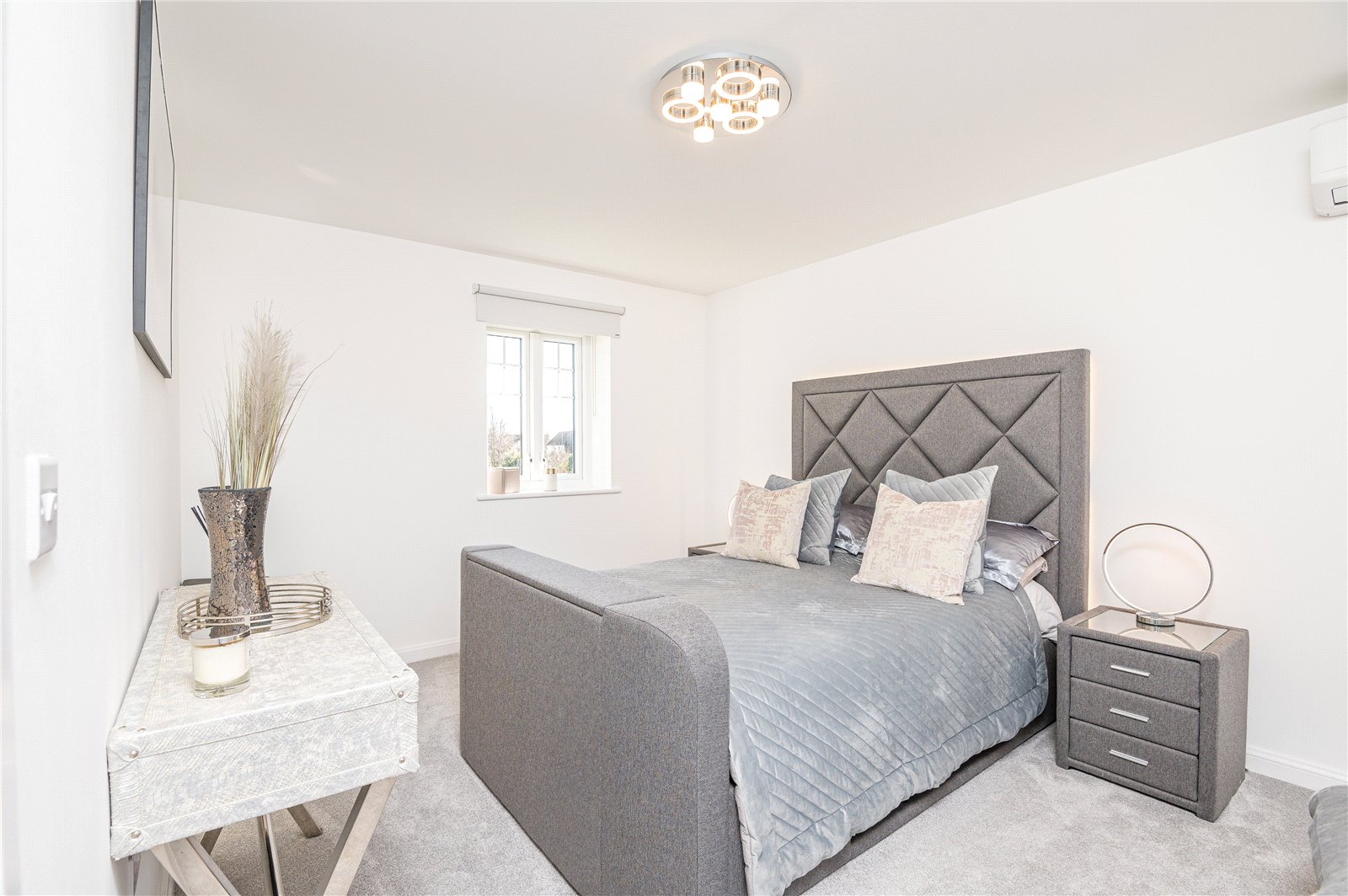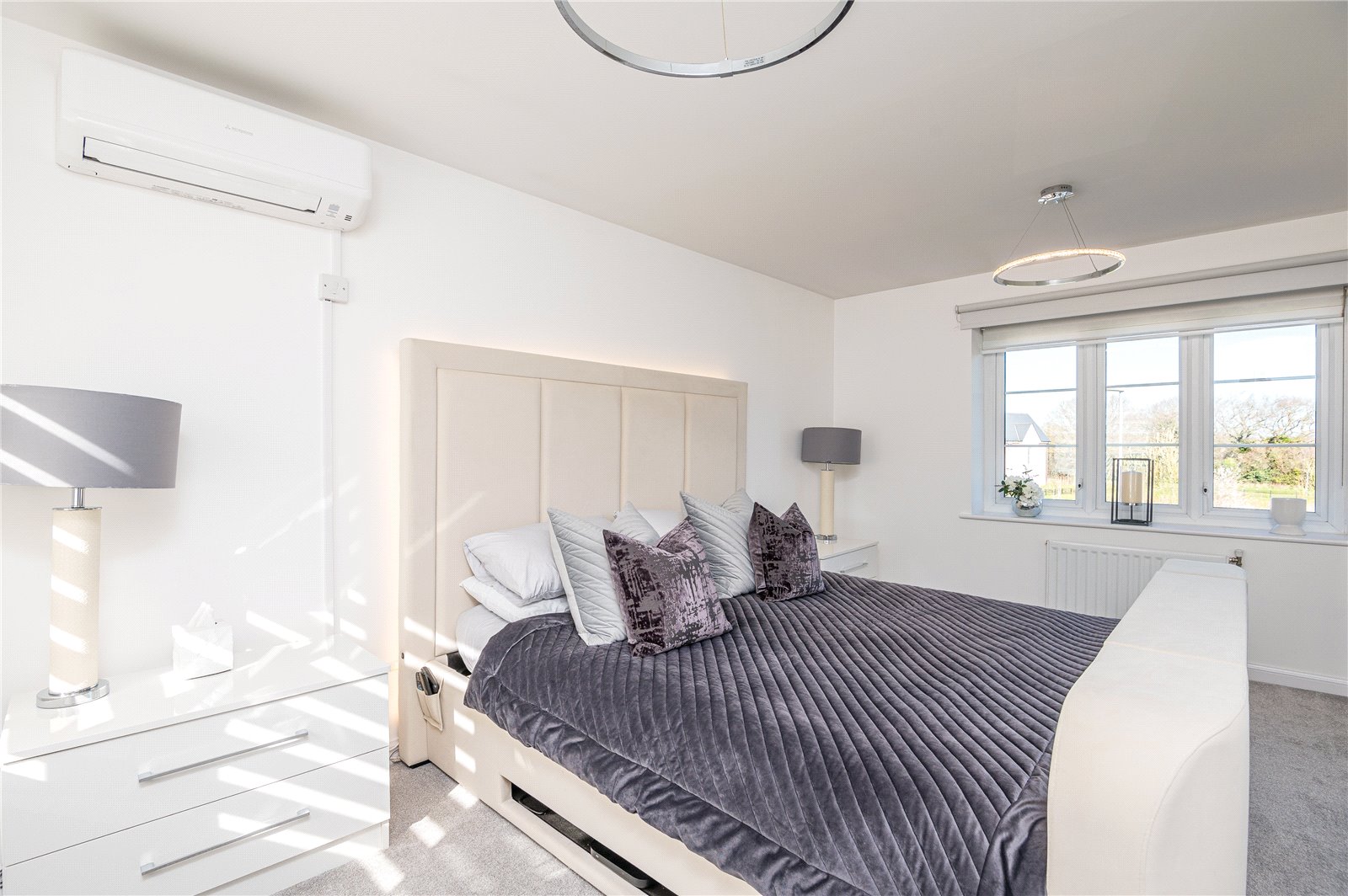 A dual aspect guest bedroom with double glazed windows to both sides (with views across adjacent parkland and ponds). Fitted 'Mitsubishi' air conditioning unit. Lipped skirting. Radiator. Smooth plastered ceiling.
