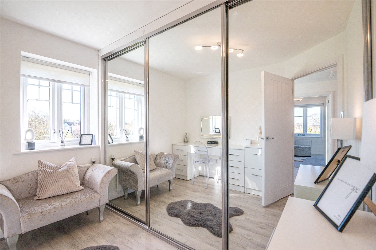 Double glazed window to side (with views across adjacent parkland and ponds). Grey oak effect flooring. Fitted with a full wall of “Sliderobe” wardrobe cupboards with hanging and shelved storage space. Radiator. Smooth plastered ceiling.