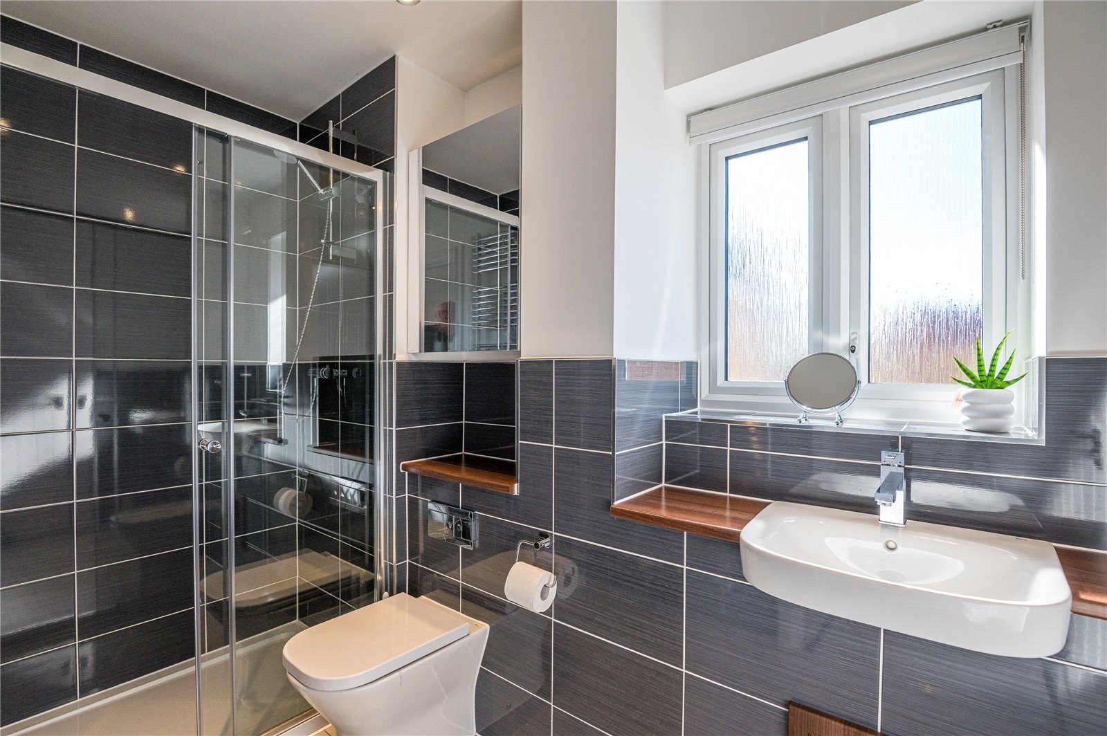 Obscure double glazed window to rear. Amtico porcelain effect flooring. Heated towel rail. Majority tiled in slate grey polished porcelain ceramics with polished walnut effect shelving and recessed storage. Fitted with a three piece suite comprising double shower enclosure with fitted shower, dual-flush integrated cistern WC and inset wash handbasin with contemporary mixer tap. Aluminium bordered edging to tiling. Smooth plastered ceiling with recessed LED lighting.