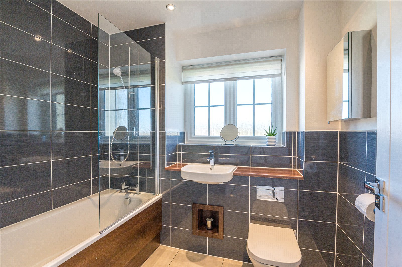 Obscure double glazed window to front. Amtico porcelain effect flooring. Heated towel rail. Majority tiled in slate grey polished porcelain ceramics with polished walnut effect shelving and recessed storage. Fitted with a three piece suite comprising panel enclosed bath with framless glass shower screen and fitted shower, dual flush integrated cistern WC, and inset wash handbasin with contemporary mixer tap. Aluminium bordered edging to tiling. Smooth plastered ceiling with recessed LED lighting.
