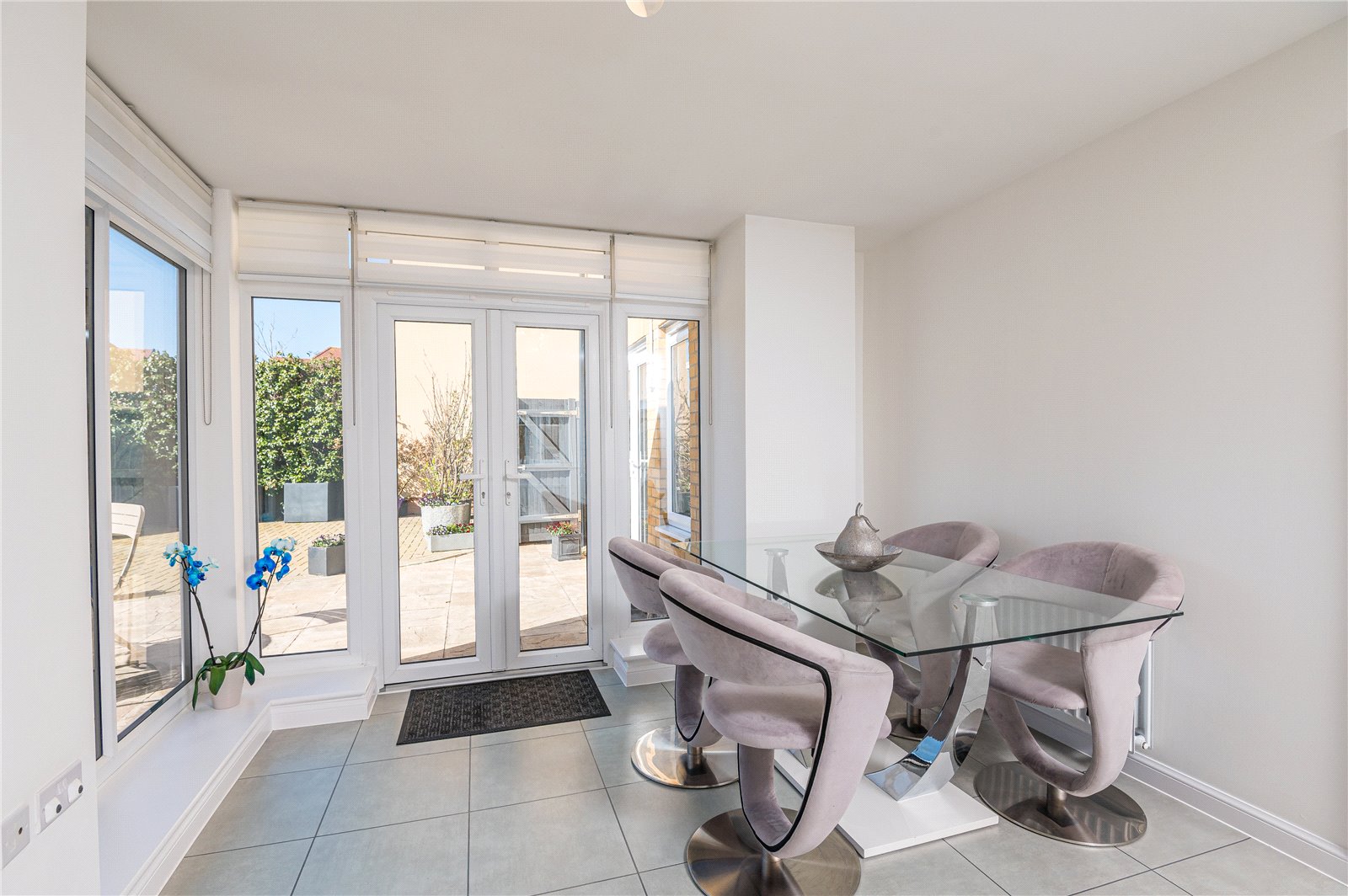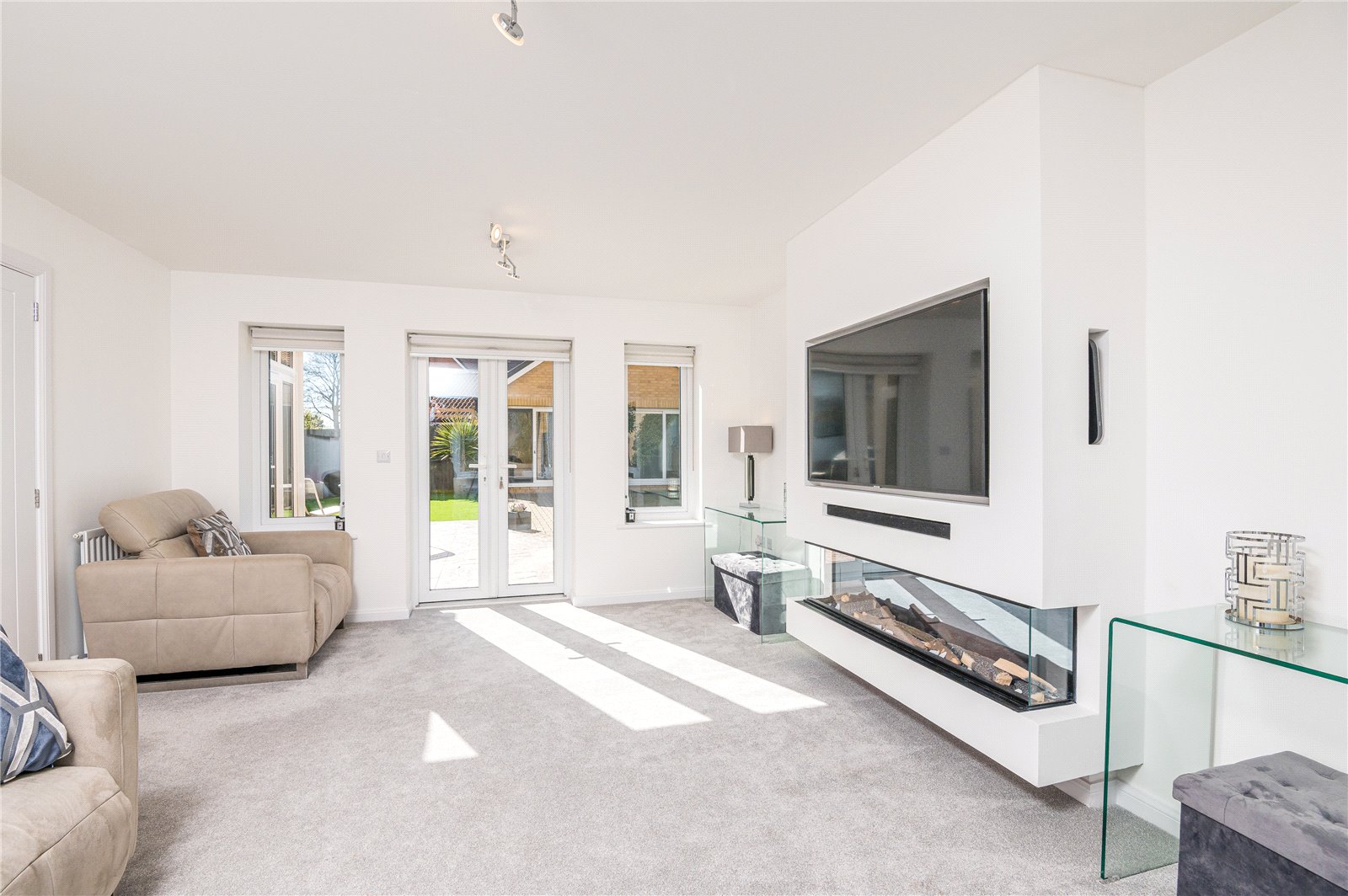 A bay fronted, dual aspect room. Double glazed four-panel bay window to front (with views across adjacent parkland and ponds) and double glazed French doors lead onto the landscaped rear garden, with twin double glazed windows adjacent. Two radiators. Professionally installed bespoke Media Wall comprising of contemporary 'Ribbon log' effect fireplace with recess and wiring for flat screen television, recess for sound bar and concealed side storage. Lipped skirting. Smooth plastered ceiling.