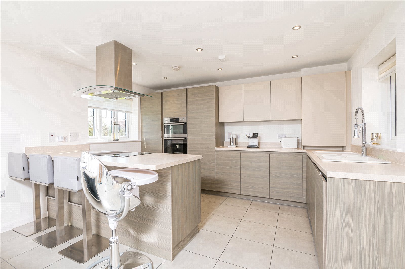 (maximum measurements) An exceptionally spacious open-plan entertaining area incorporating kitchen/breakfast and family room areas. A triple aspect room with two double glazed windows to side (with views across adjacent parkland and ponds), double glazed window to rear and double glazed window to alternate side. A pair of French doors with matching full height side panels lead onto the landscaped rear garden. 'Amtico' porcelain effect flooring. Two radiators. The beautifully appointed Chef’s kitchen comprises a comprehensive range of base, full-height and contrasting eye level cabinets with contemporary squared edged working surfaces and matching upstands. Inset one and a half bowl sink unit with designer mixer tap. The full complement of high end integrated appliances include a split level 'AEG' fan assisted electric oven with grill, dishwasher, washer/dryer, fridge, freezer, and black glass “wok burner” induction hob with contemporary extractor canopy above a peninsular breakfast bar with seating for four. The family room area has integrated wiring for flatscreen television. Smooth plastered ceiling with recessed LED lighting.