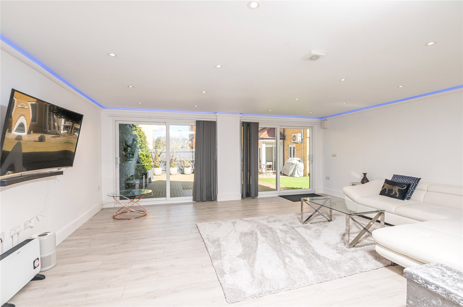 (overall measurements) Two sets of uPVC double glazed patio doors to front, light grey oak effect flooring, integrated wiring for flat screen TV. Feature remote controlled LED trough lighting and smooth plastered ceiling with recessed LED lights. Agents Note: Formerly a detached double garage - and now suitable for a variety of leisure/'work from home' uses. An open doorway leads off to: