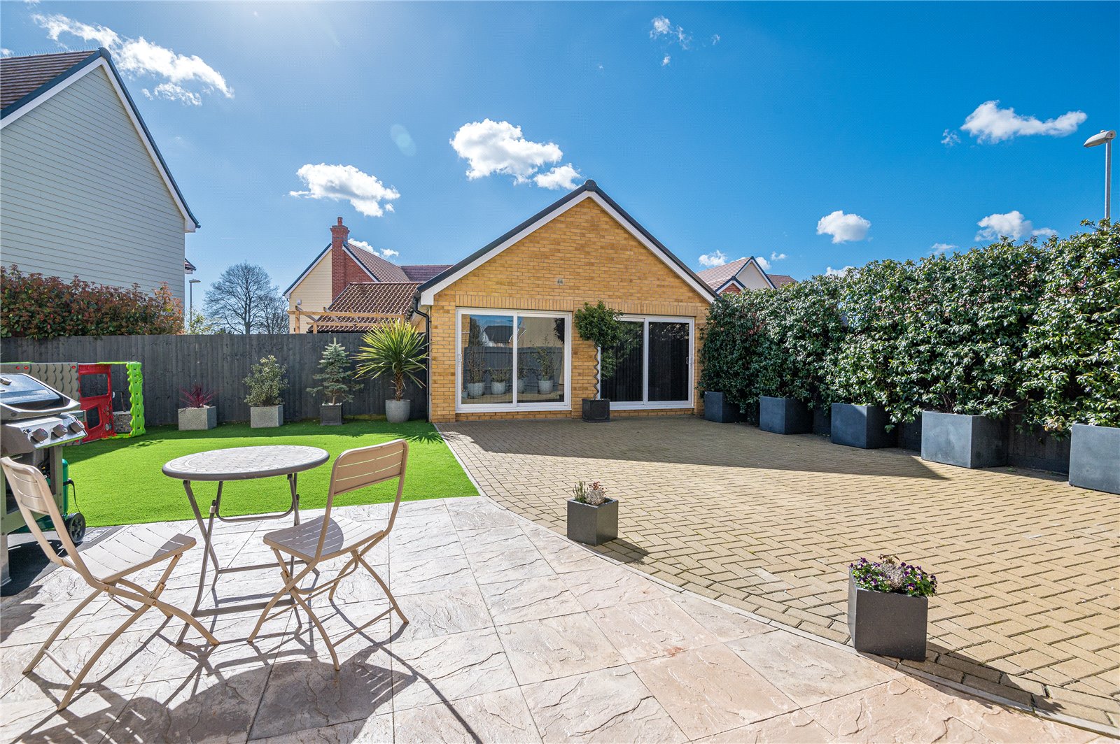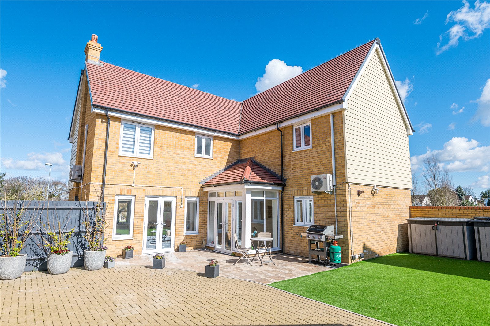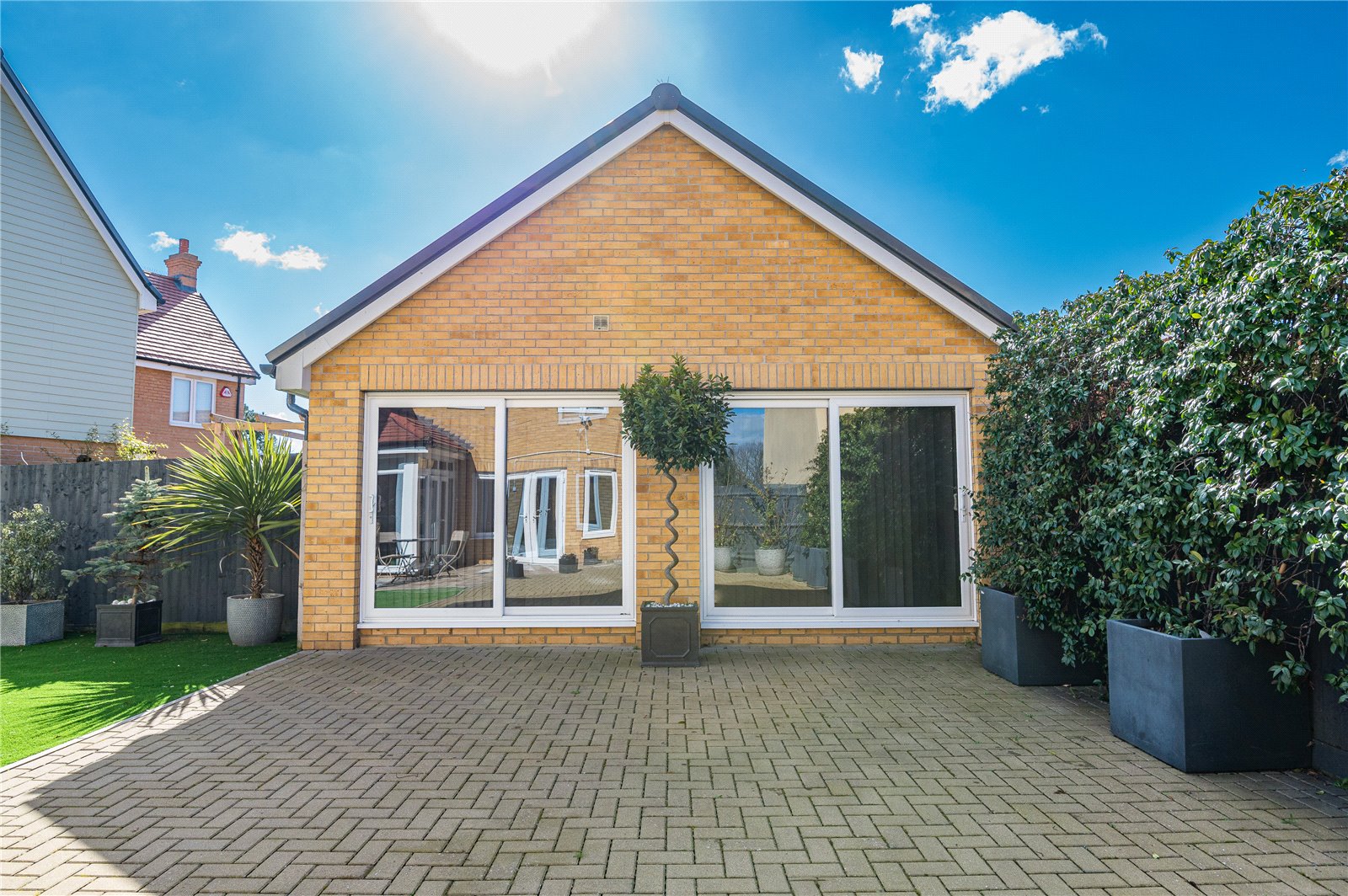 Professionally landscaped in low maintenance style and commencing from the sitting room and kitchen/family room with a stone paved terrace (ideal for dining al-fresco). This area extends to a large herringbone paved terrace with high quality artificial lawn adjacent. Walled frontage to the adjacent parkland and fenced boundaries to side and rear. External lighting, external water supply. Secure gated side access to the front driveway.