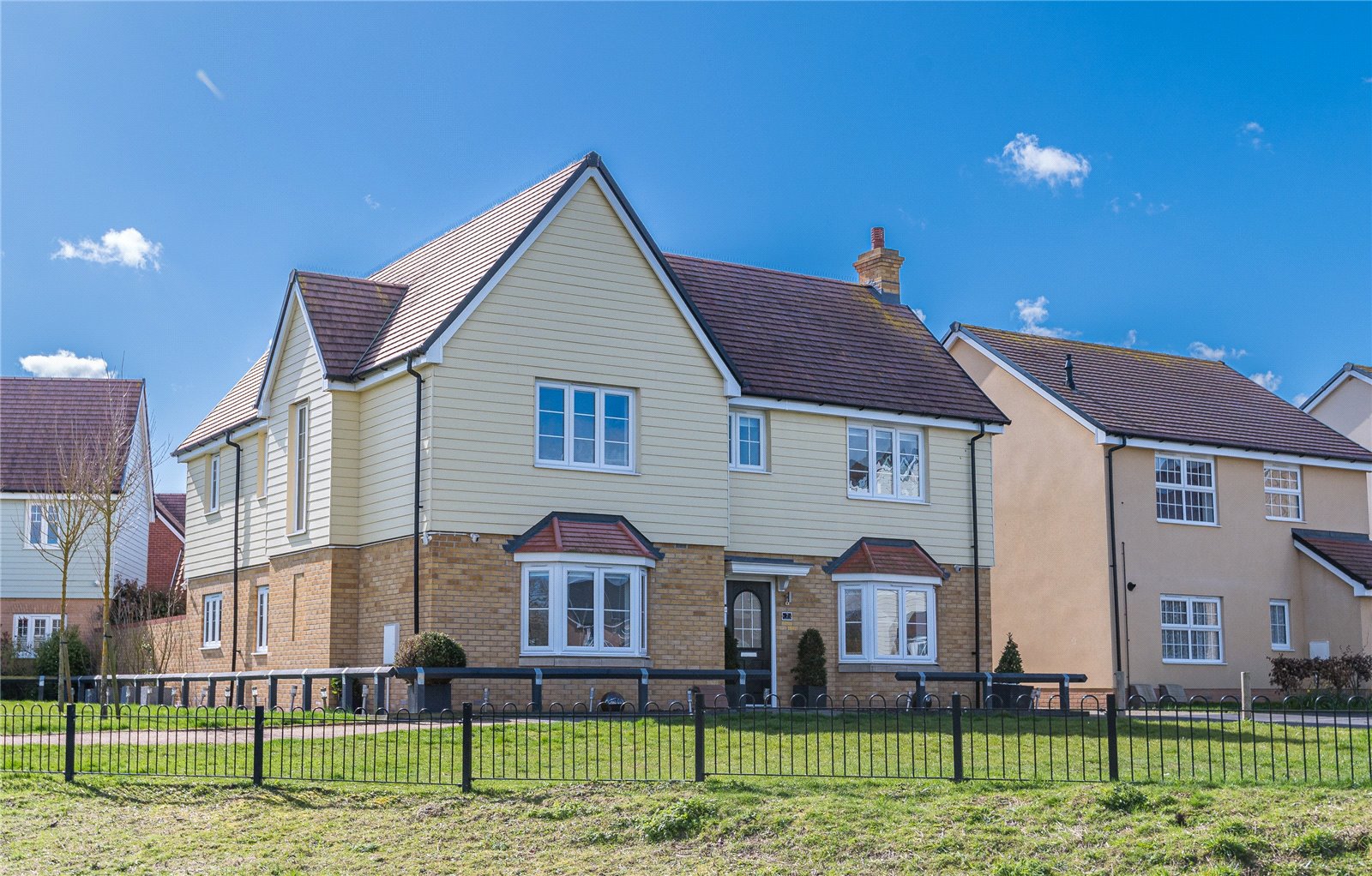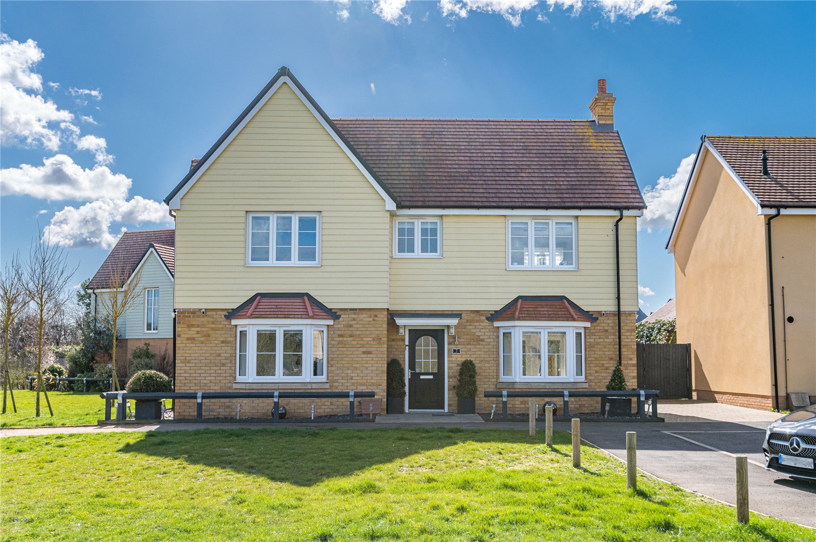 Slate shingled frontage with low level timder bar fencing and an adjacent double width private driveway in herringbone brick paviour.