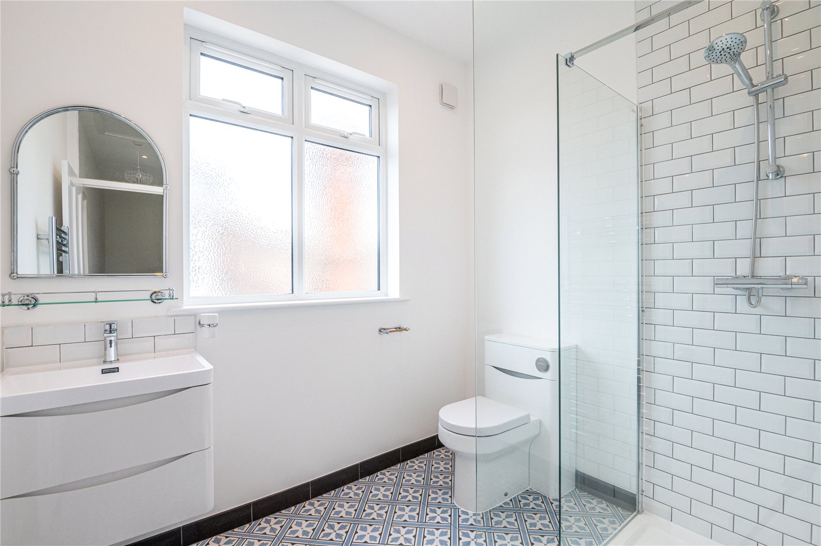 Spacious shower room with brand new luxury white suite comprising Shower Cubicle with tiled walls, wash basin with storage beneath and low flush WC. Chrome heated towel rail. Double glazed window to side.