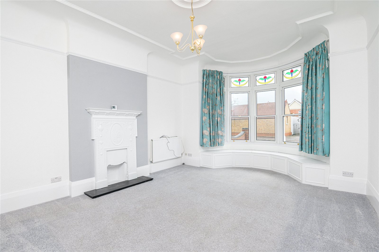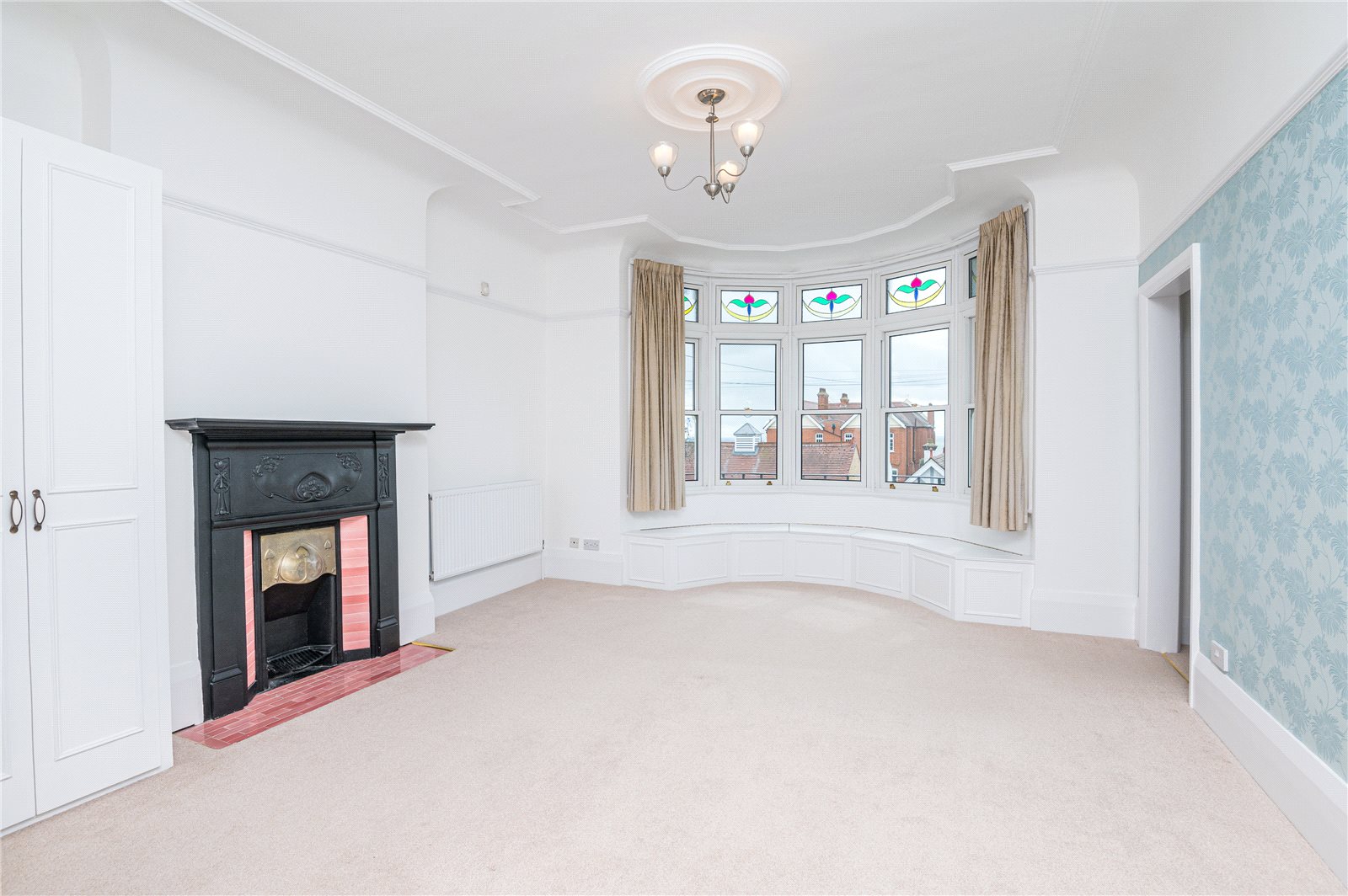 Double glazed curved bay window to front with built in window seat / storage. The room affords lovely views across Thorpe Bay tennis courts, Thames Estuary and Kent coastline. Attractive original 'art nouveau' cast iron fireplace with pink tiled inserts and hearth. Range of built in wardrobe cupboards. Picture rail. Ceiling rose. Radiator. Door to;
