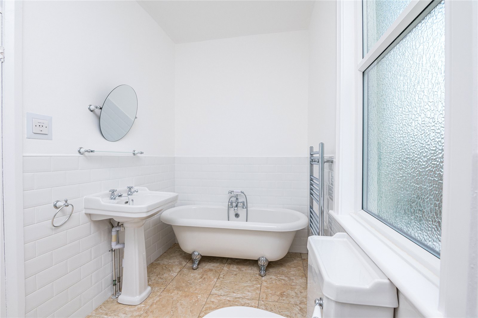 Spacious bathroom fitted with a luxury modern white suite comprising free standing rolled top bath with mixer tap, shower attachment and claw feet. Separate double fully tiled corner shower cubicle. Pedestal wash basin. Low flush WC. Half tiled walls. Tiled floor. Chrome heated towel rail. Two double glazed windows to side. Radiator.