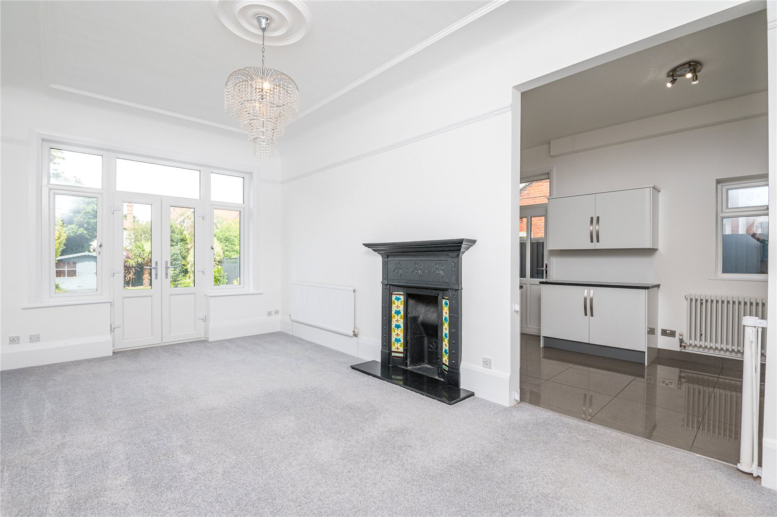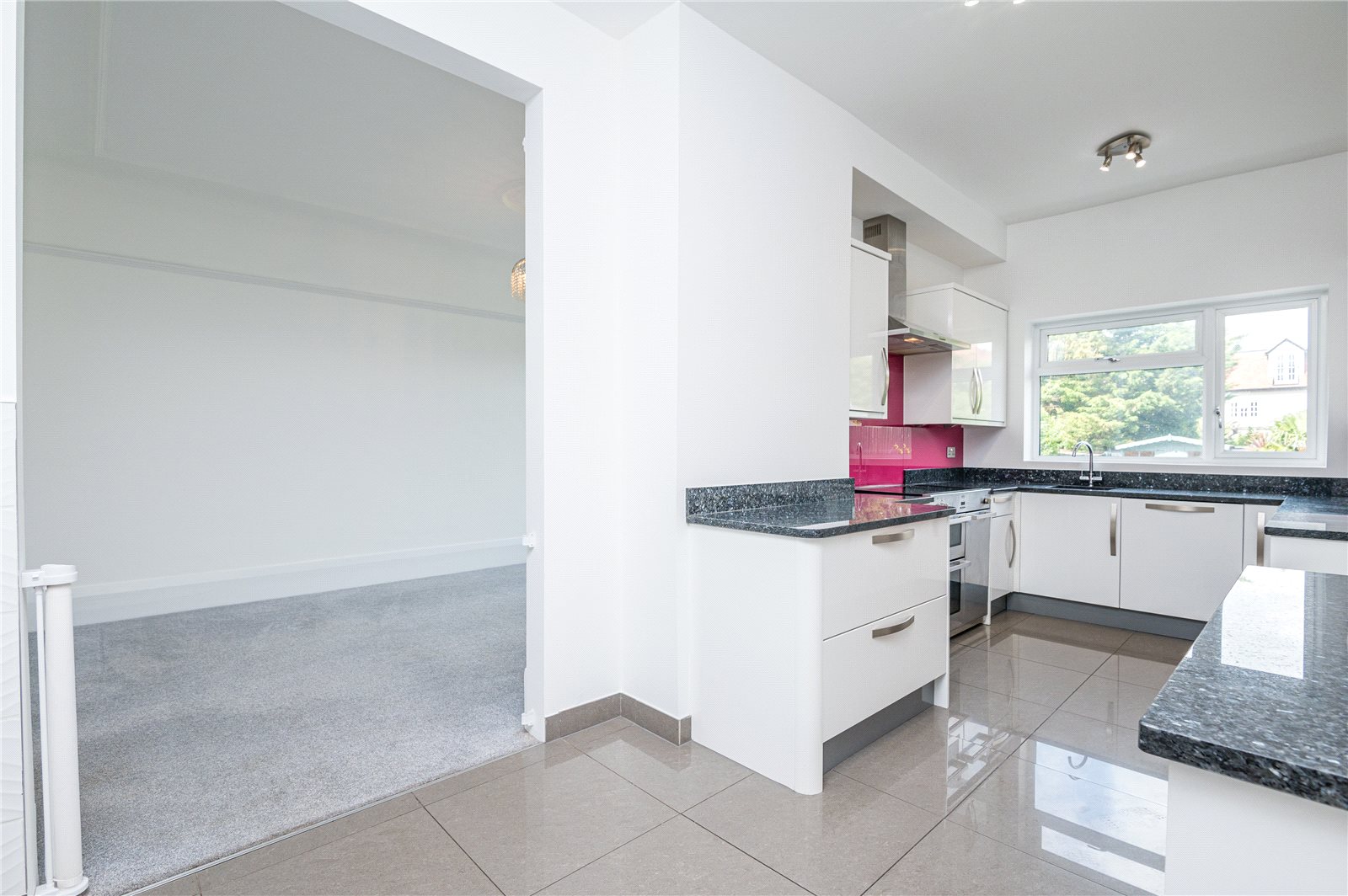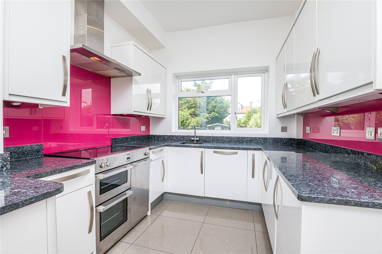 Bright double aspect room with double glazed windows to side and rear overlooking the garden. Double glazed door to side. The kitchen is fitted with a modern contemporary range of white high gloss fronted units comprising granite work surfaces with inset sink unit and mixer tap. Range of cupboards below. Built in dishwasher with matching decor panel. Inset Range Style cooker with stainless steel extractor above. Further granite work surfaces with cupboards below. Built in fridge and freezer with matching decor panels. Wall mounted storage cabinets. Pretty pink glass splashbacks. Grey porcelain tiled floor. Radiator. Space for breakfast table.