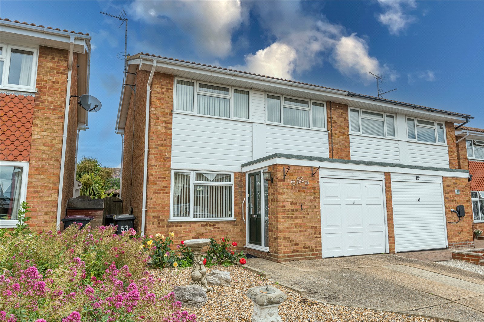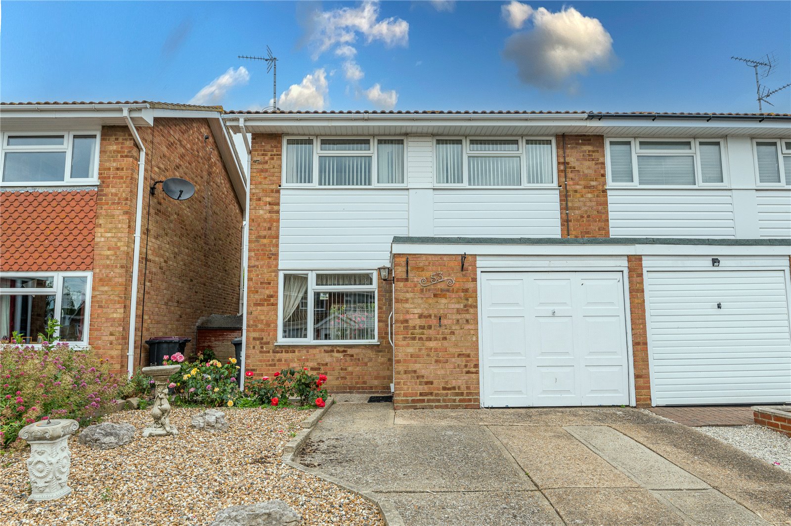 Independent driveway giving access to the semi-integral garage with up and over door to front, power and light connected, and an adjacent shingled front garden.
