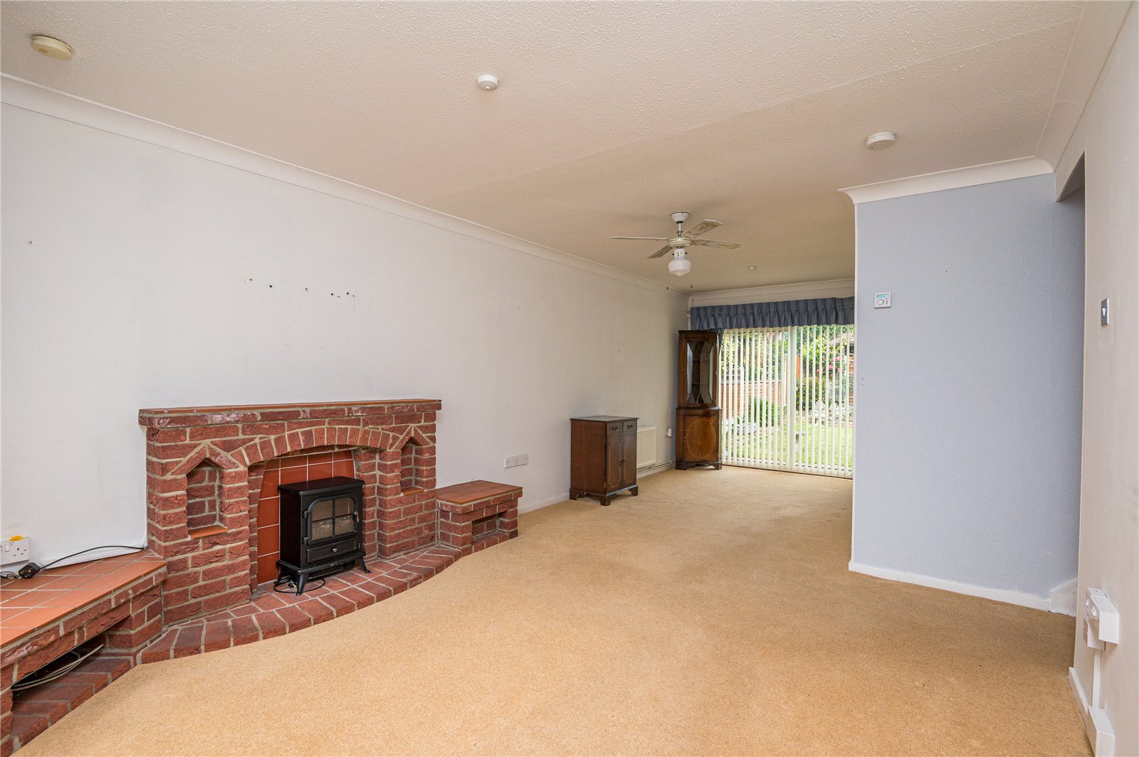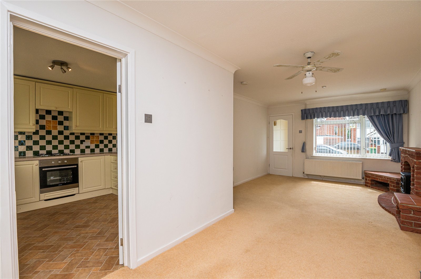 (maximum) An impressive dual aspect room with double glazed patio doors giving access to the rear garden and double glazed window to front. Feature brick ornamental fireplace with extending display plinths and display niches on brick hearth with tiled reveal. Radiator. Television aerial point. Turned staircase to first floor. Coved cornice to ceiling. An etched glass door leads through to:
