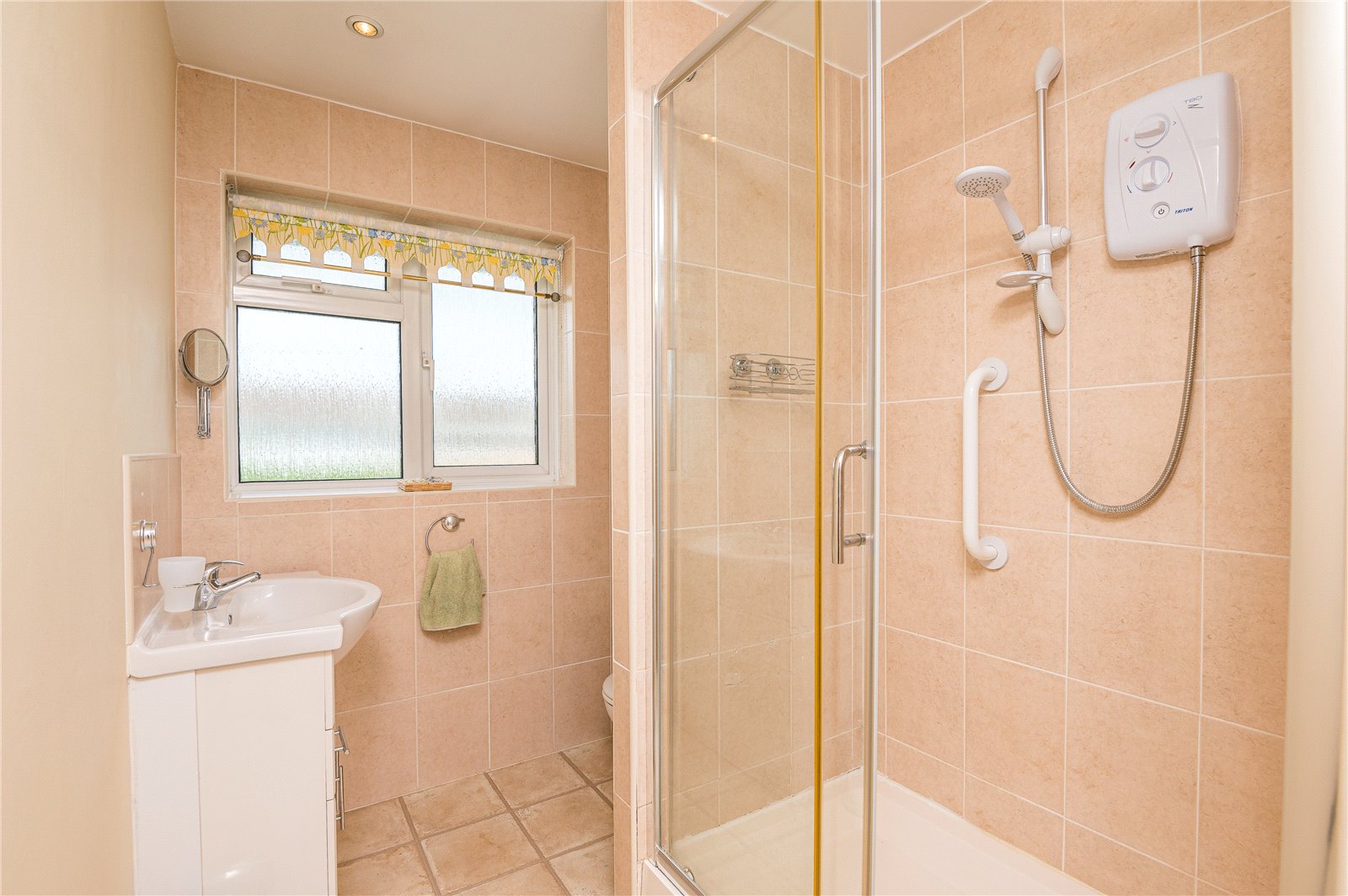Obscure Upvc double glazed window to front. Fitted with a three piece suite comprising a fully tiled double width shower enclosure housing a 'Triton T80' electric shower, vanity wash hand basin with gloss fronted storage cupboard and drawers beneath, and dual flush WC. Heated towel rail. Access to airing cupboard housing gas boiler serving domestic hot water and central heating system, with slatted linen shelving. Full tiling to shower, basin and WC area. Travertine effect cushioned flooring. Smooth plastered ceiling with recessed LED lighting.
