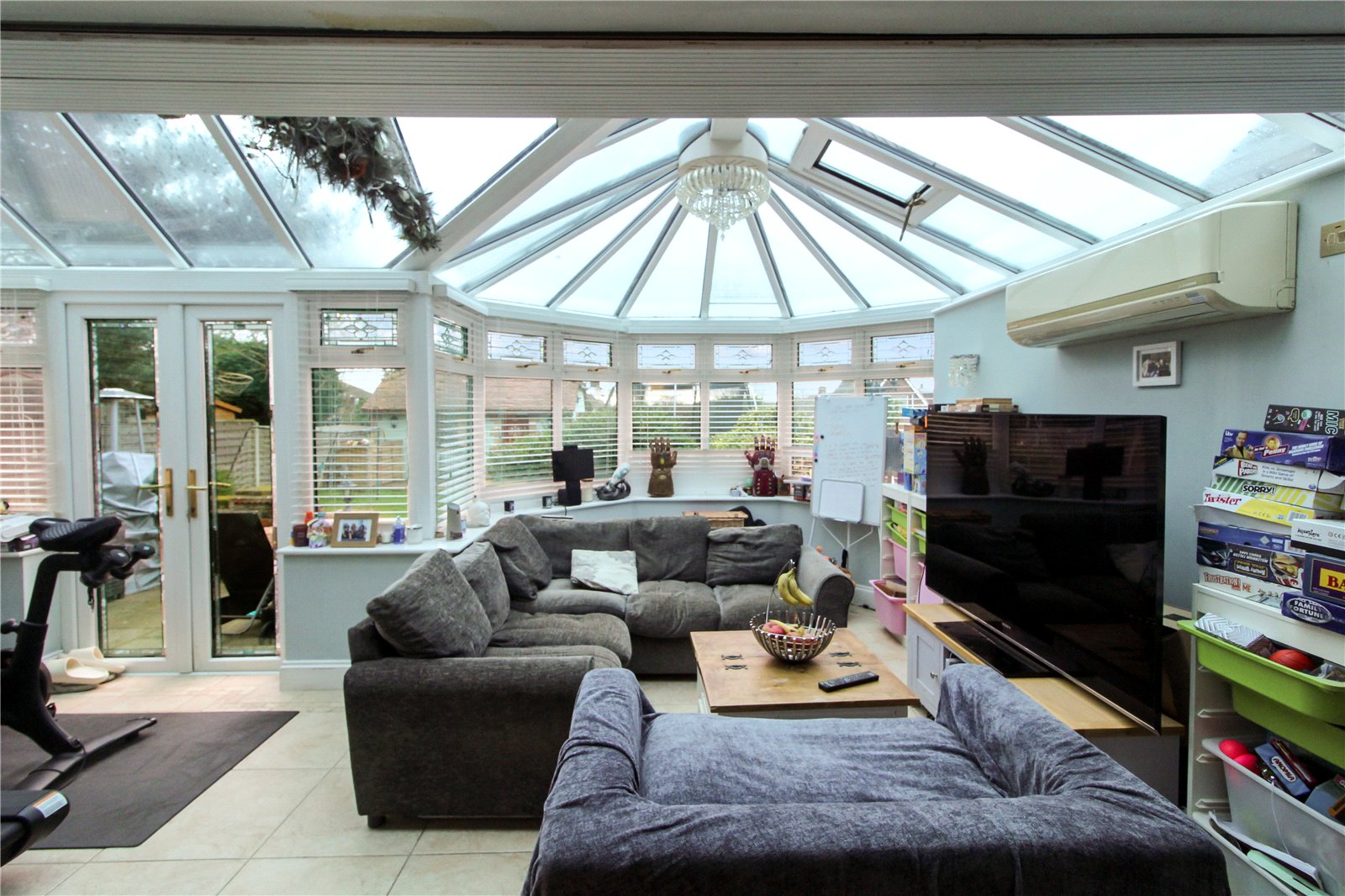 Large conservatory space, currently used as an exercise / play room, tiled floor, air conditioning, double glazed French doors to rear garden.