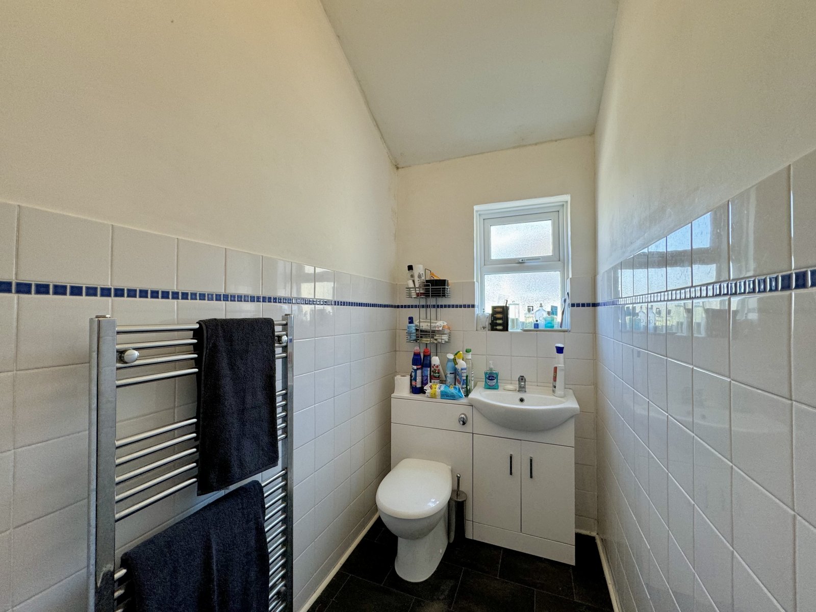 UPVC double obscured glazed window to side. Fitted with a two piece suite comprising concealed WC and wash basin with mixer tap and storage cupboard beneath. Chrome heated towel rail. Tiled effect vinyl flooring. Part tiled walls. Smooth plastered ceilings.