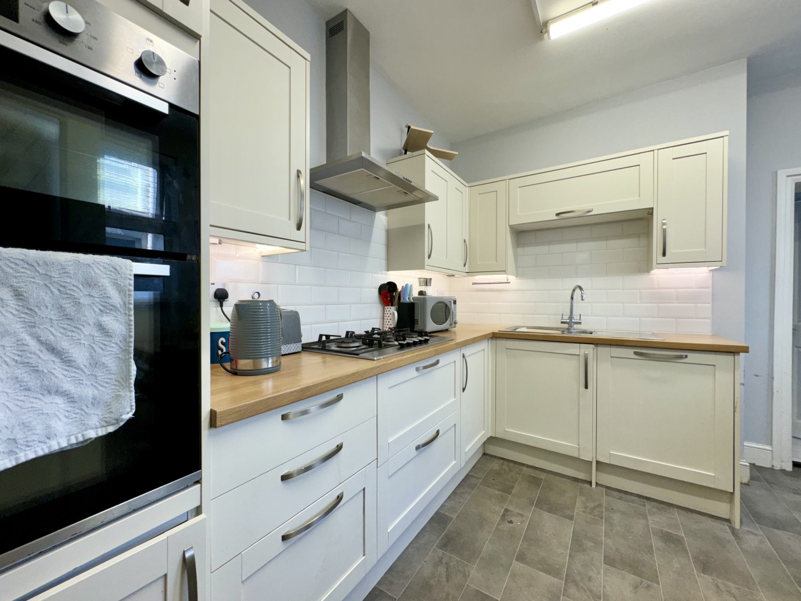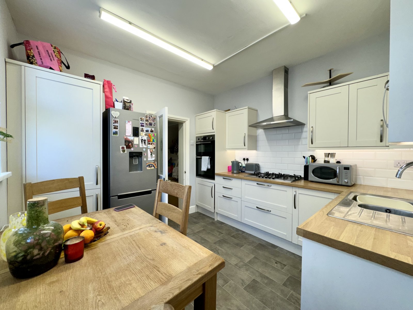 Two UPVC double glazed windows to side. Kitchen is fitted with a modern range of base and eye level Shaker style cabinets incorporating a wood effect rolled edge working surface, inset one and a half bowl stainless steel sink with mixer tap and drainer unit. Inset five burner gas Range hob with canopied extractor hood above. Integrated electric fan assist double oven. Integrated dishwasher. Space for free standing fridge/freezer. Tiled effect vinyl flooring. High level skirting. Wall mounted radiator. Smooth plastered ceilings. Door to rear provides access to the: