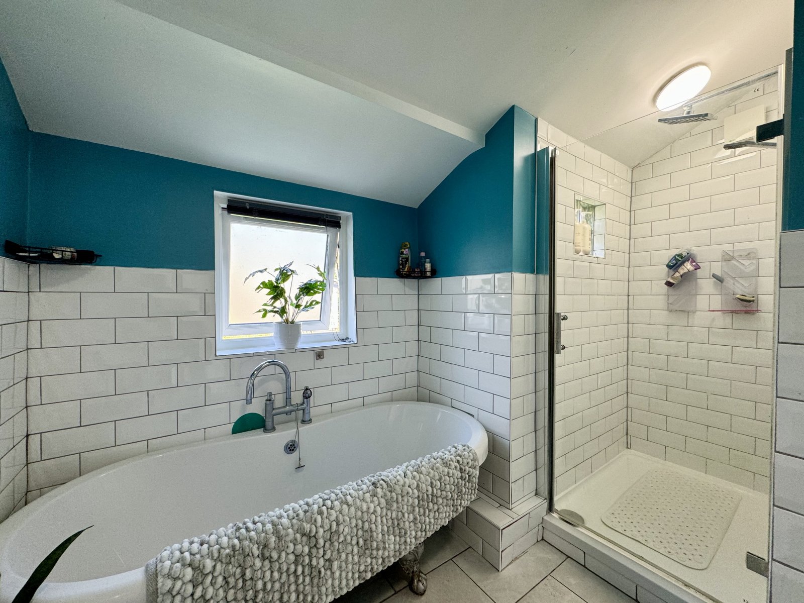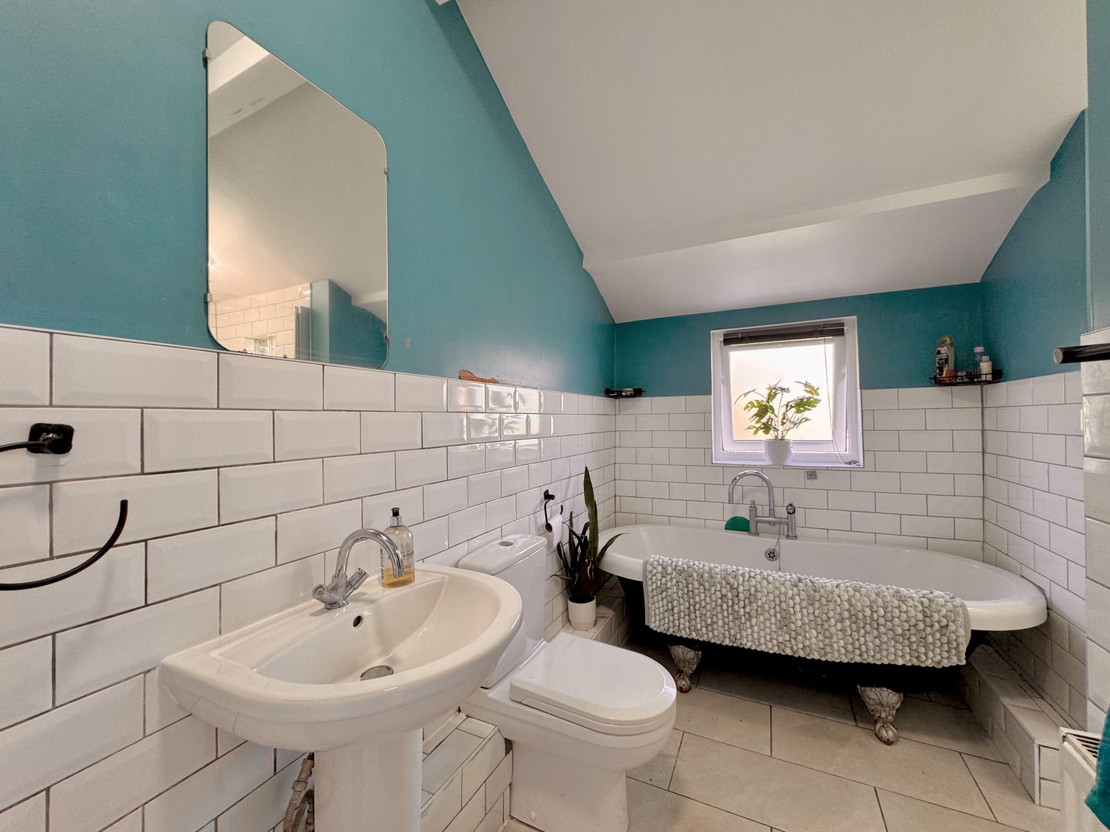 overall size. UPVC double obscured glazed window to rear. Bathroom is fitted with a four piece suite comprising low flush WC, pedestal wash basin with mixer tap and free standing rolled top bath with mixer tap and larger than average enclosed shower cubicle with glass shower screen. Wall mounted mixer with rainfall showerhead plus further detachable showerhead. Feature obscured glazed glass block window to side. Wall mounted radiator. Fully tiled floors. Part tiled walls. Smooth plastered ceilings. Storage cupboard to front housing combination gas fired boiler.