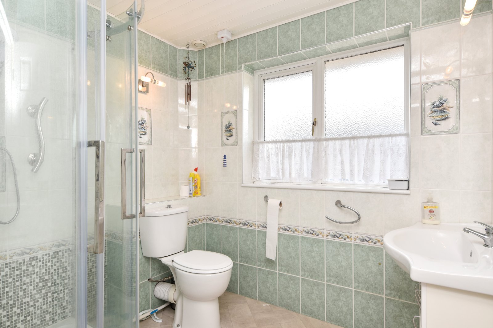 Obscure uPVC double glazed window to front aspect. The spacious Bathroom offers a three piece white suite comprises independent shower enclosure inset with wall mounted 'Triton' shower with handheld and further 'drencher shower head over, vanity wash hand basin with mixer tap over and storage cupboards under and low level flush wc. Tiling to all visible walls. Tiled flooring. Wood panelled ceiling.