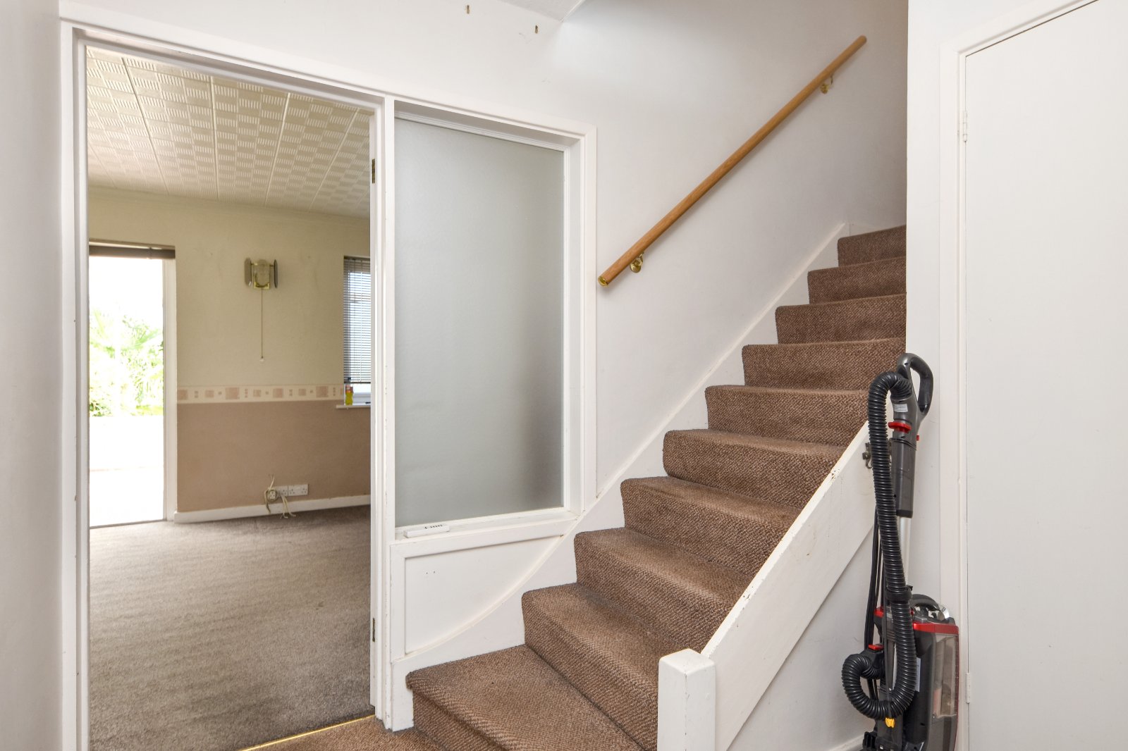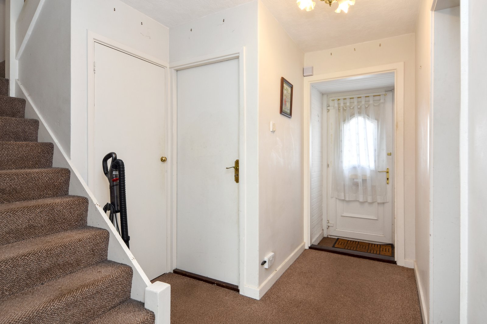 Turned staircase to first floor accommodation. Open access to Kitchen. Panelled door to Living Room with obscure glazed 'borrowed light' panel to side. Door to Cloaks cupboard with hanging space and shelving. Courtesy door to Garage. Papered ceiling.