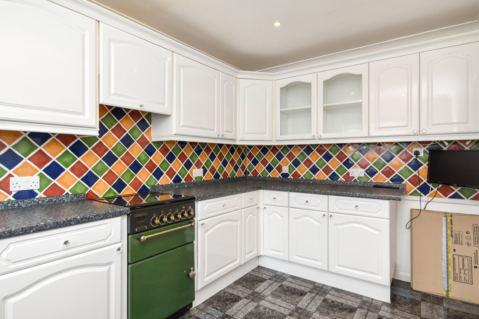 uPVC double glazed window to front aspect. The Kitchen is fitted with a comprehensive range of eye and base level units to three aspects ample rolled edge working surfaces over inset with single drainer sink unit with over tap over. Freestanding 'Rangemaster' oven with four ring gas hob (to remain) with concealed extractor over. Various wall mounted glass fronted display cabinets. Under unit lighting. Under counter space for appliances. Tiling to worksurface areas. Tiled flooring. Textured ceiling inset with recessed lighting.