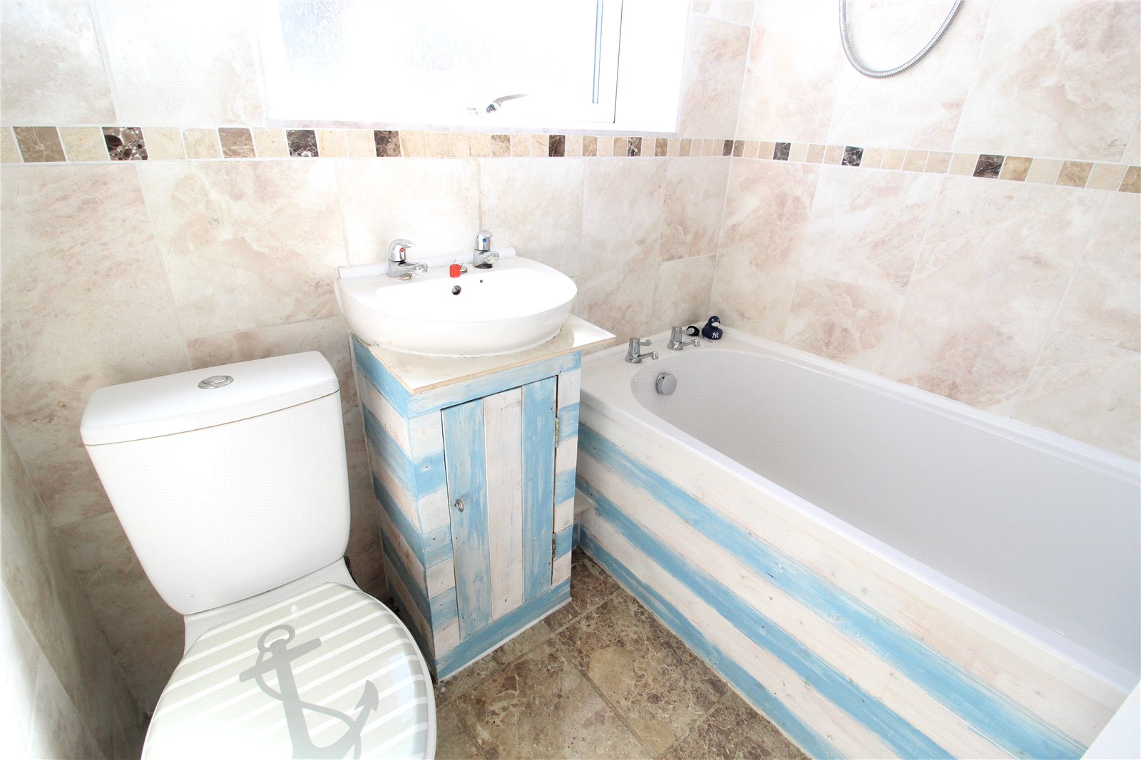 Fitted with a white three piece suite comprising panelled bath with separate shower over. Wash hand basin set within vanity unit. Low flush w.c, Heated towel rail. Double glazed window to side.