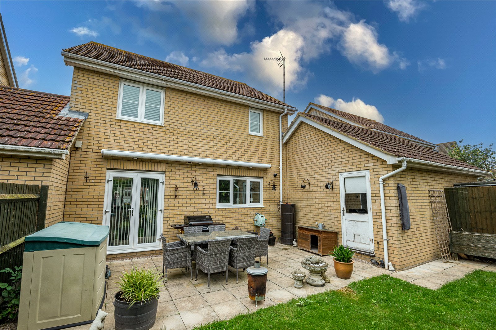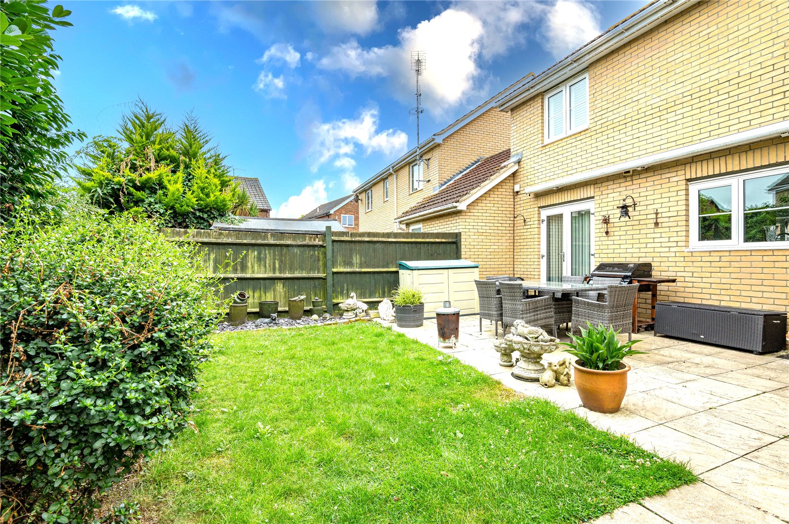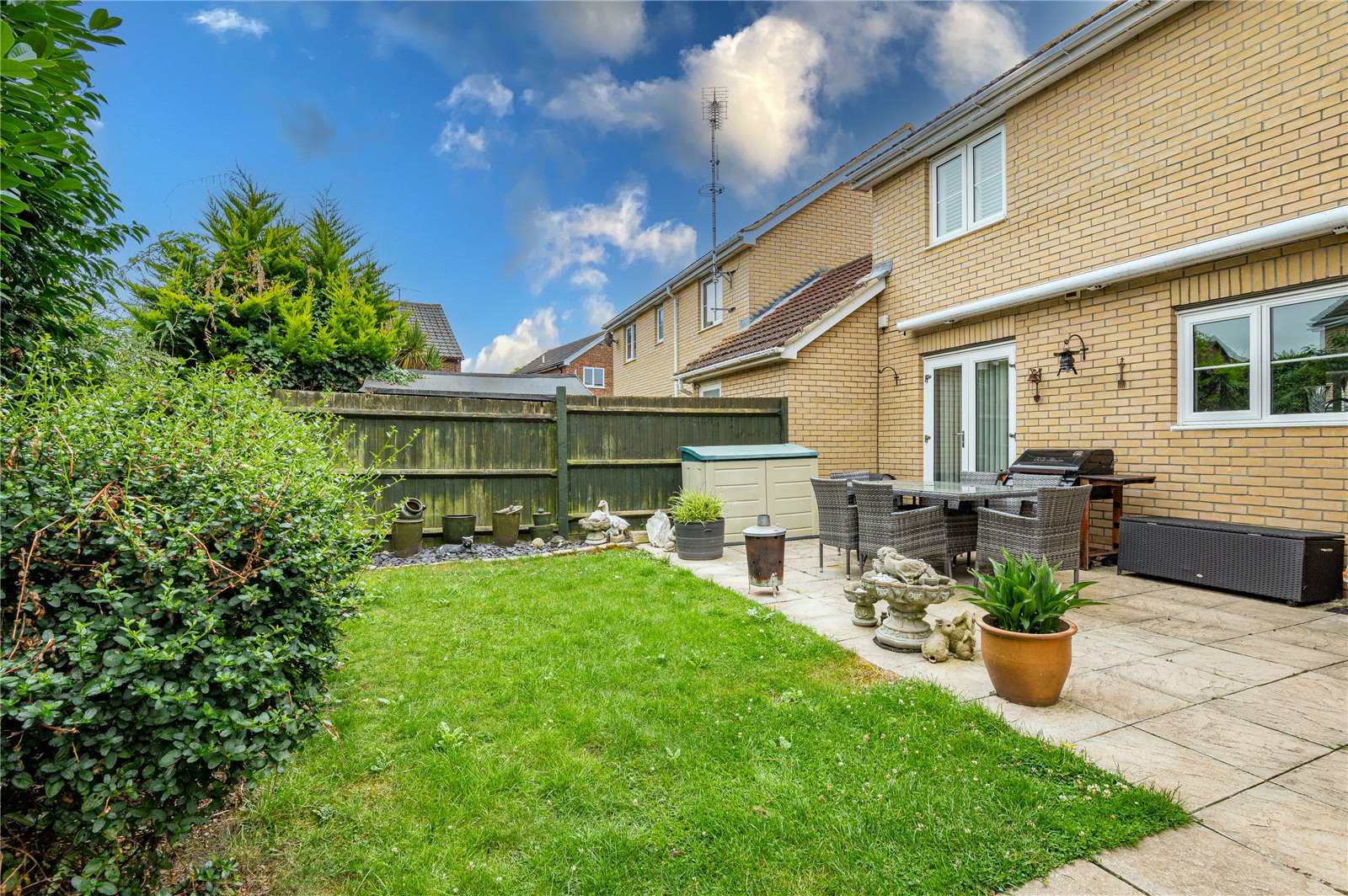 The rear garden commences from the kitchen/dining room with a slate effect stone paved patio terrace, ideal for dining al fresco, that extends to a footpath to the rear of the garage. The garden has been professionally landscaped, and has an expanse of lawn with slate shingled border and planted beds with fenced boundaries. Fitted full width sun canopy. A personal door gives access to the attached garage. External lighting. External water supply.