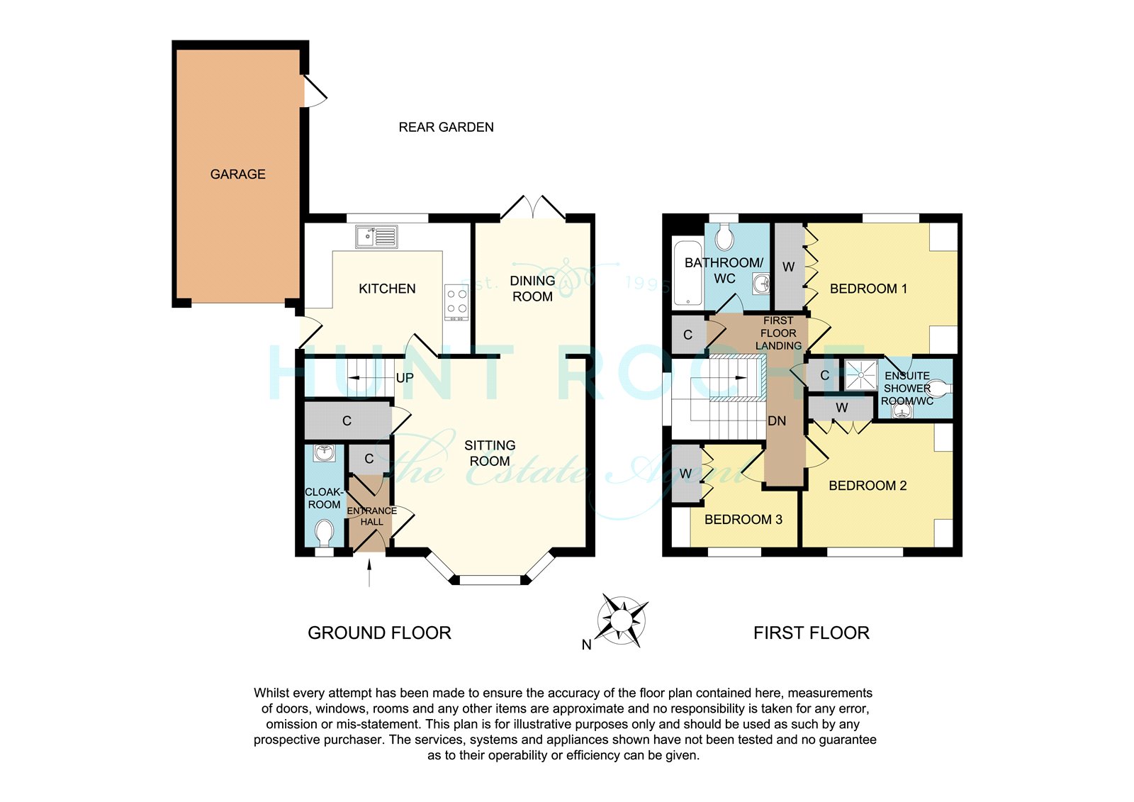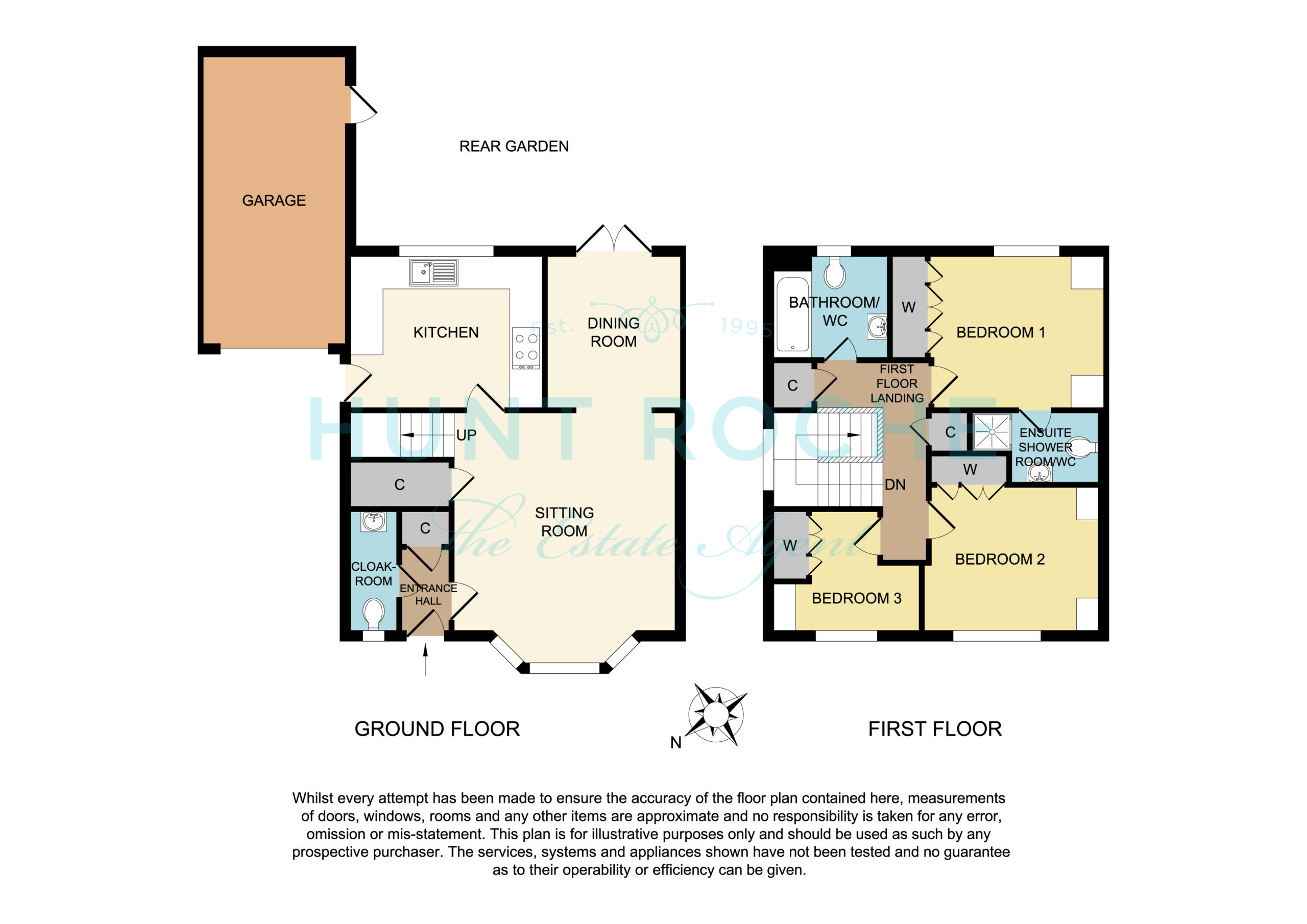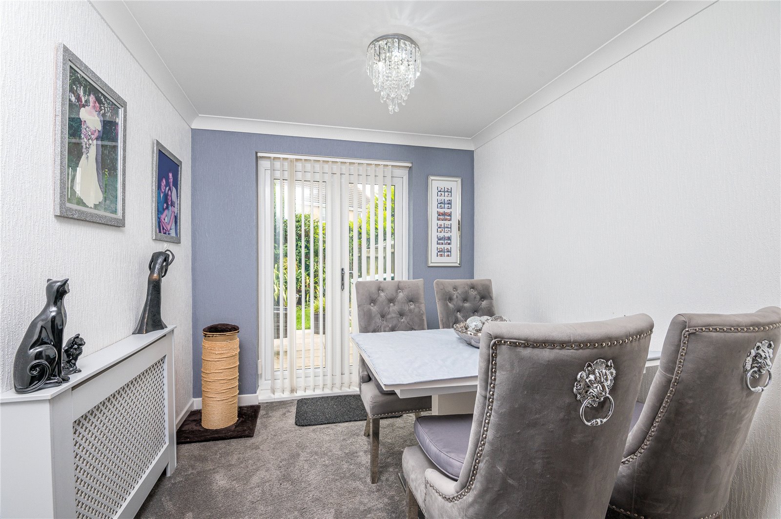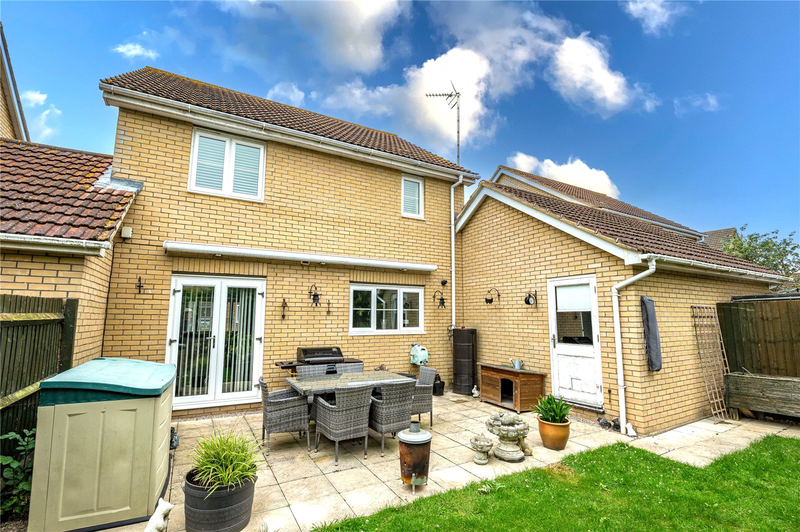The rear garden commences from the kitchen/dining room with a slate effect stone paved patio terrace, ideal for dining al fresco, that extends to a footpath to the rear of the garage. The garden has been professionally landscaped, and has an expanse of lawn with slate shingled border and planted beds with fenced boundaries. Fitted full width sun canopy. A personal door gives access to the attached garage. External lighting. External water supply.
