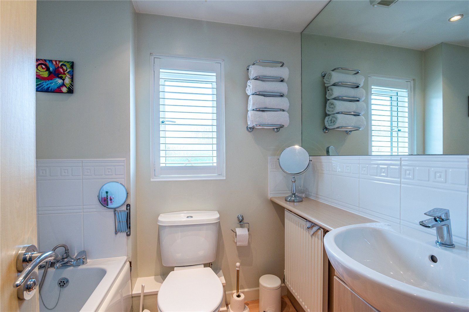 Fitted with a three piece suite comprising of independent fully-tiled shower enclosure, vanity wash hand basin with storage cupboard beneath, and dual flush close coupled WC. Radiator. Ceramic tiled splashbacks. Fitted full mirrored wall. Electric shaver point. Extractor fan. Smooth plastered ceiling with recessed LED lighting.