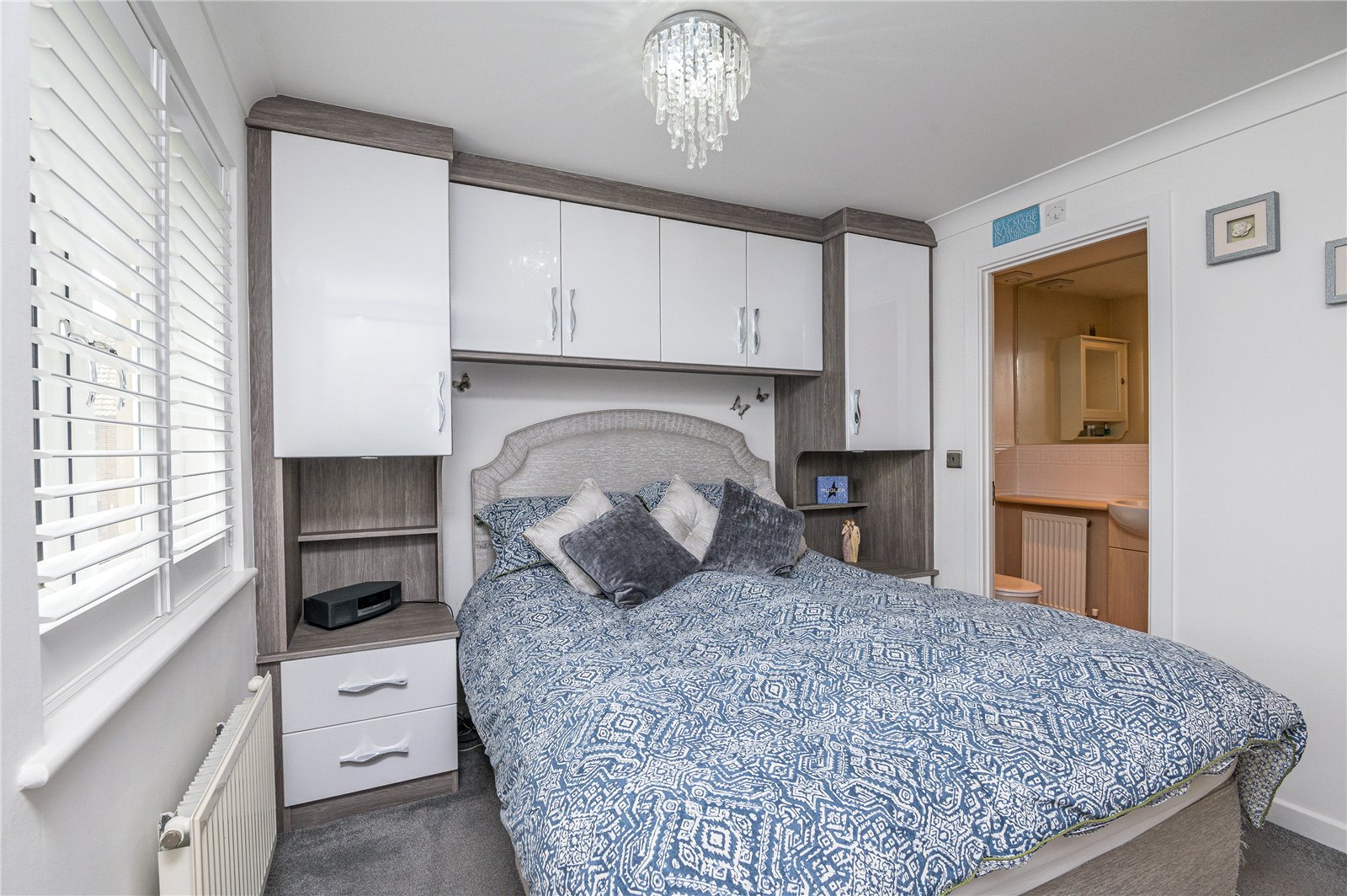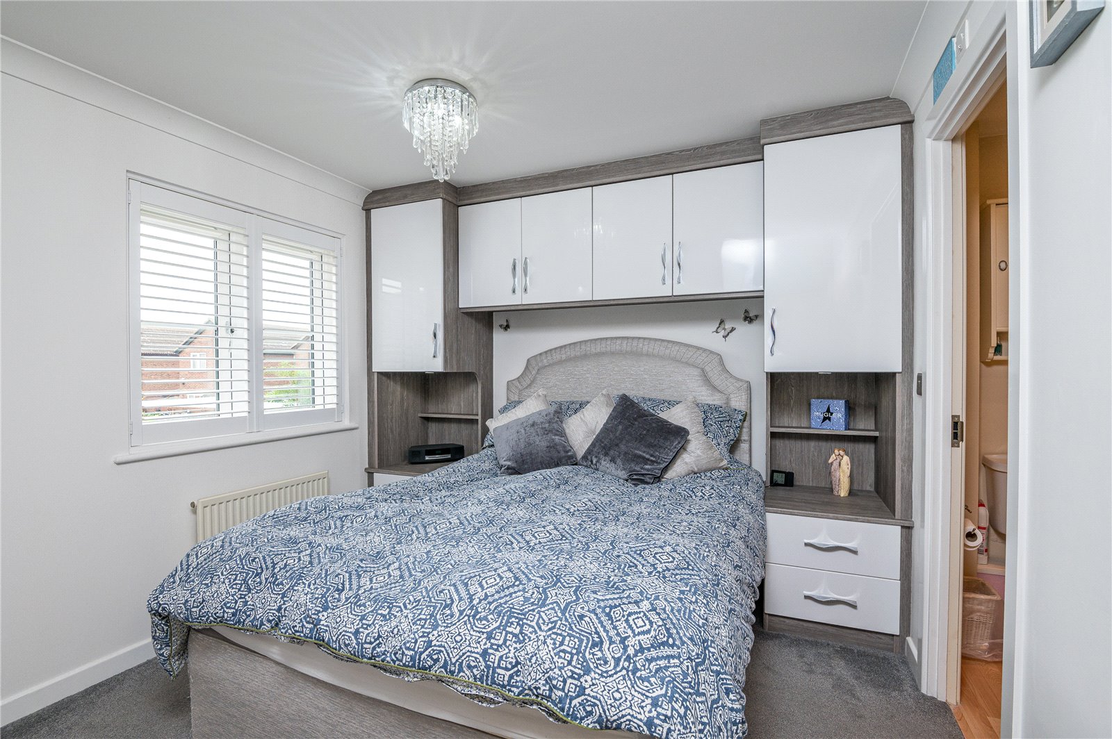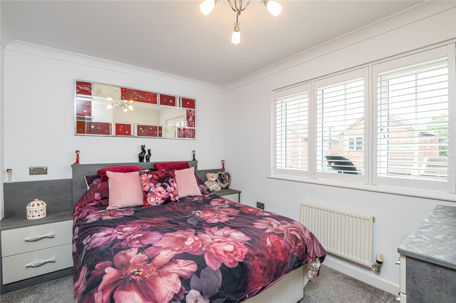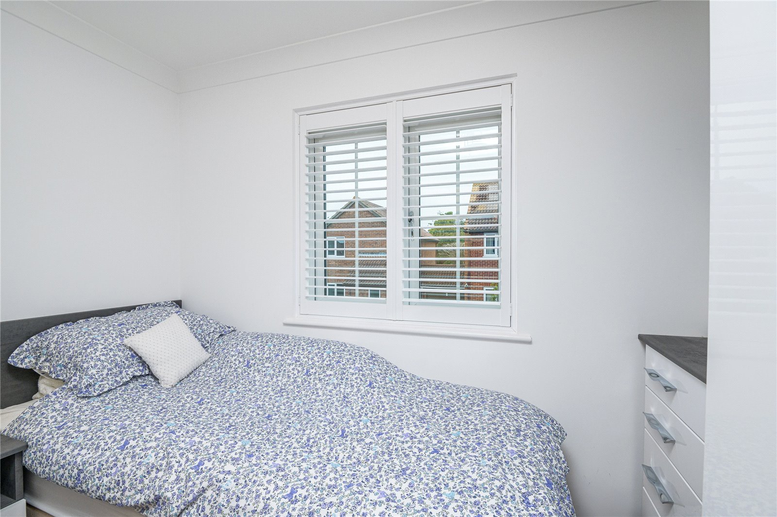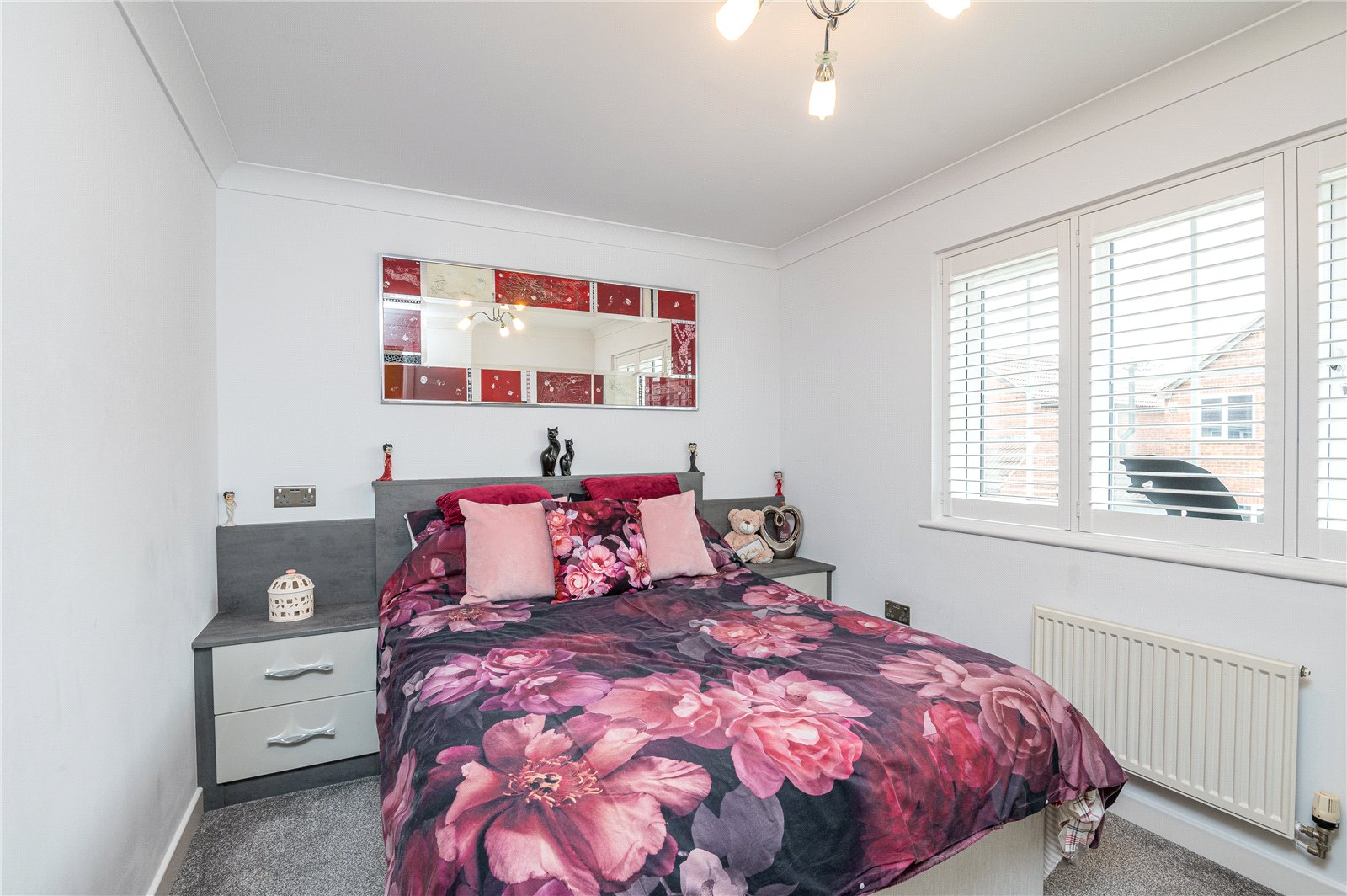 uPVC double glazed multi pane style window to front with bespoke fitted plantation shutter. Radiator. Range of fitted bedroom furniture comprising of one double and one single full height wardrobe cupboard with full height drawer stack, and bedside cupboard with matching headboard. Coved cornice to smooth plastered ceiling.