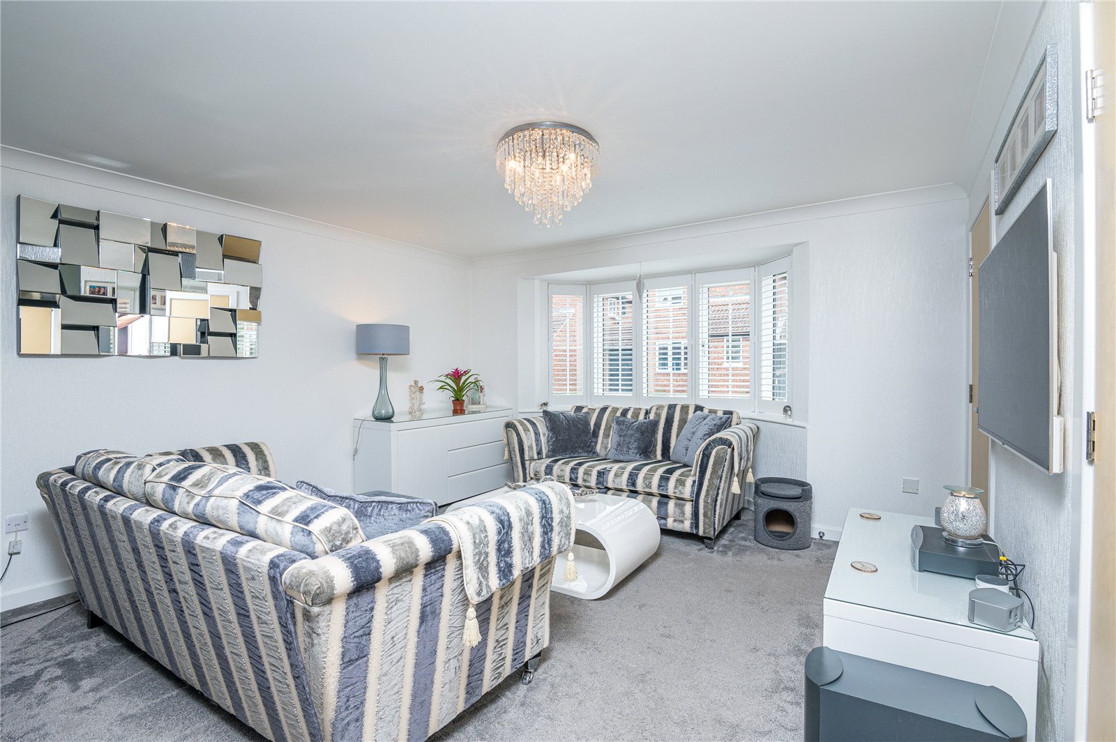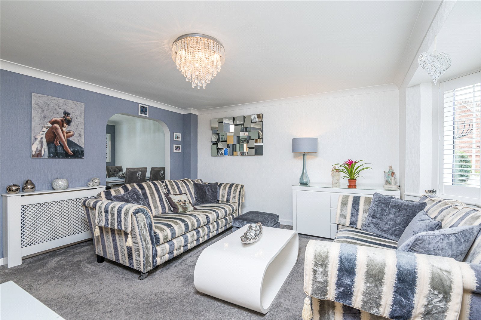 A bay fronted room with uPVC double glazed multi pane style bay window to front with bespoke fitted plantation shutter. Radiator in ornamental cabinet and further radiator. Television aerial point. Turned staircase to first floor part galleried landing. Access to understairs storage cupboard. Coved cornice to smooth plastered ceiling. A double width flat headed opening leads through in open plan style to: