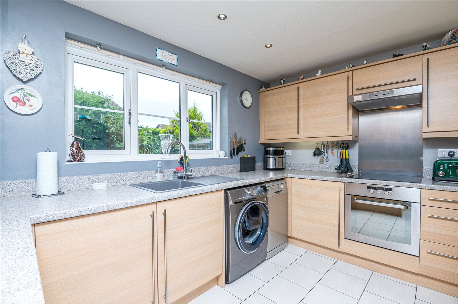 uPVC double glazed multi pane style window overlooks the rear garden, and obscure double glazed panelled door gives side access to the front of the property and the private driveway. The kitchen is fitted with a comprehensive range of base and pelmeted eye level cabinets in contemporary oak effect units, with squared edged granite effect working surfaces and inset polycarbonate sink unit with mixer tap. There are matching upstands. The range of integrated appliances includes split level fan assisted electric oven with four ring induction hob, with brushed steel splashback and brushed steel extractor canopy above. Space and supply for American style fridge/freezer. Space, plumbing and drainage for automatic washing machine and slim line dishwasher. Corner extra space units. Access to cupboard housing gas combination boiler serving domestic hot water and central heating system. Tiled floor. Smooth plastered ceiling with recessed LED lighting.