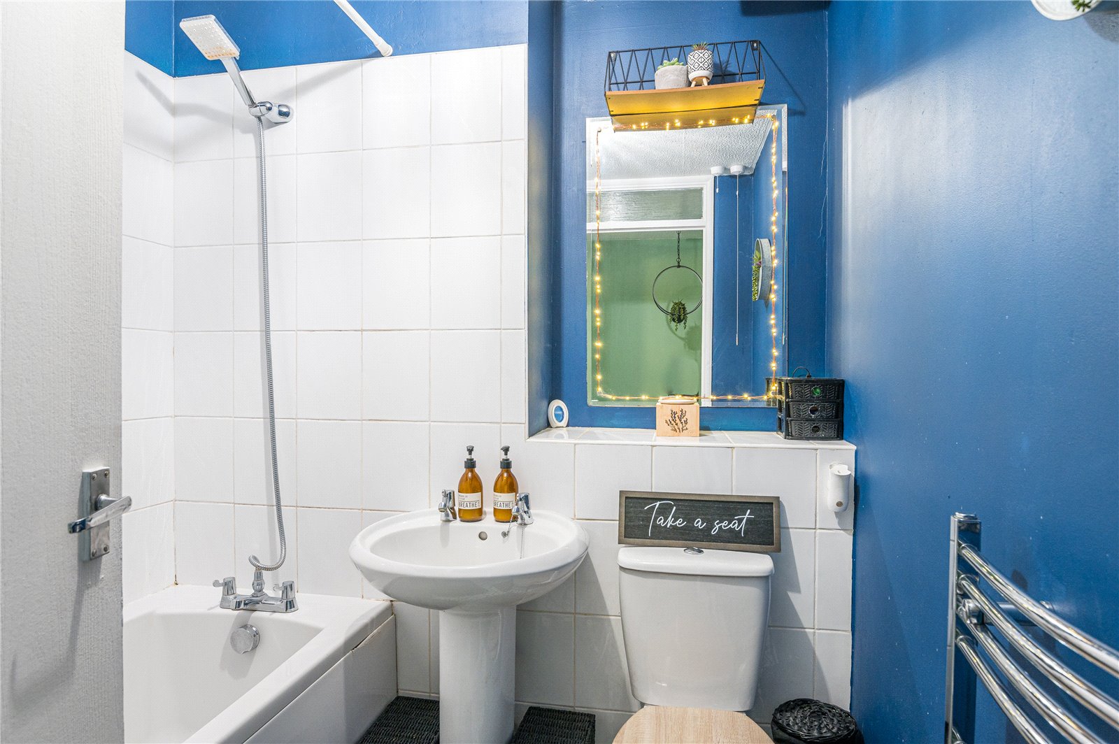 Fitted with a three-piece suite comprising panel enclosed bath with mixer tap and shower attachment, pedestal wash handbasin, and dual-flush close coupled WC. Heated towel rail. Full ceramic tiling to the bath and shower area, and half-height tiling to one wall. Drop light switch. Extractor fan.