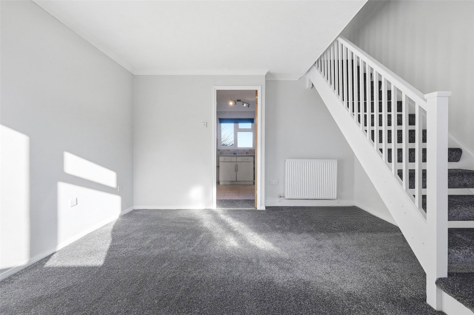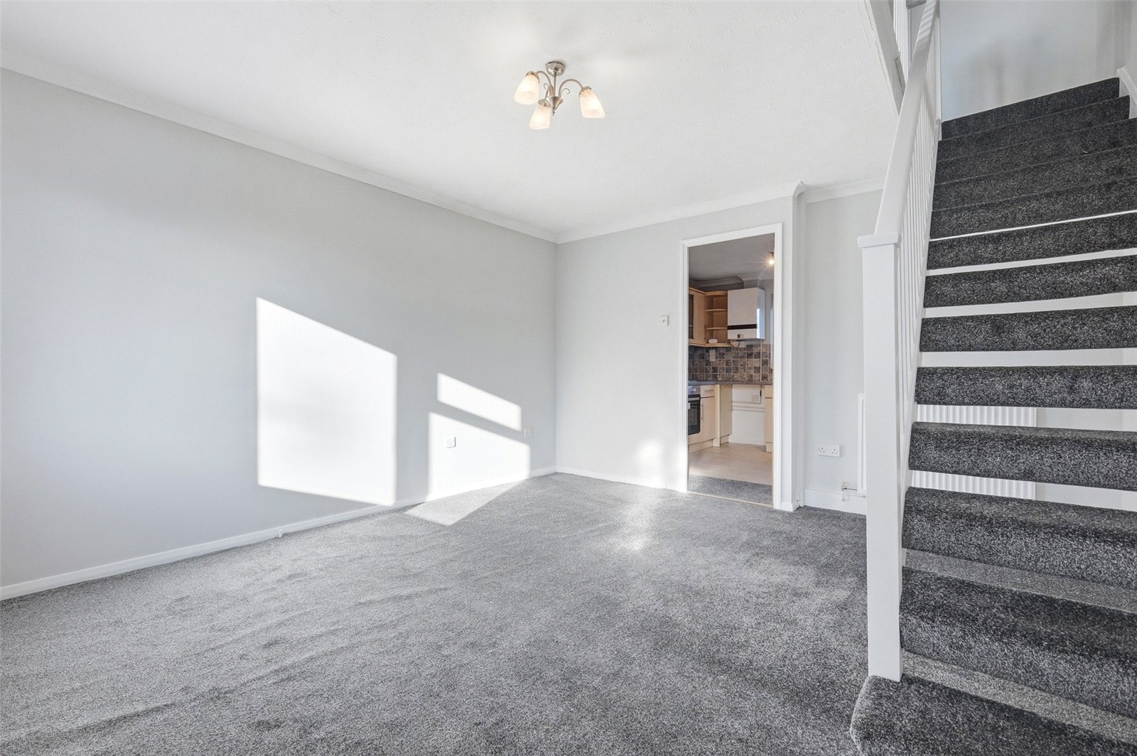 Double glazed window to front. Access to cupboard housing metres. Open tread staircase to first floor landing. Television aerial point. Radiator. Coved cornice to smooth plastered ceiling. Door leads through to: