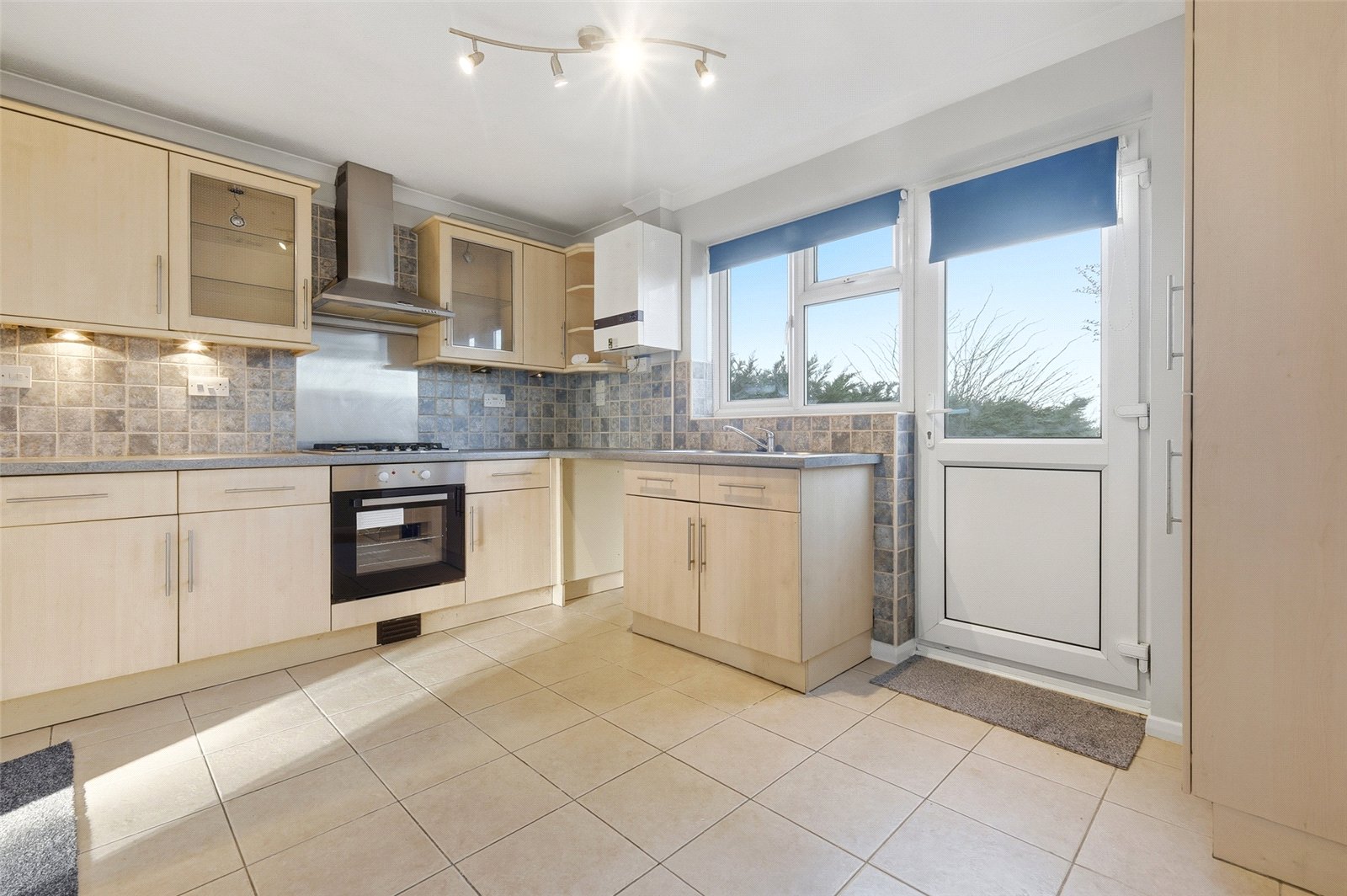 Double glazed door giving access to the rear garden, and double glazed window to rear. The kitchen has been fitted with a comprehensive range of base, and eyelevel cabinets in light oak effect, including two glass fronted display cabinets. Rolled edged working surfaces and inset one and a quarter bowl stainless steel sink unit with mixer tap. Brushed steel splashback to hob. The range of integrated appliances includes split level electric oven, and four ring gas hob with blushed steel extractor canopy above. Space, plumbing and drainage for automatic washing machine. Further appliance space. Wall mounted boiler serving domestic hot water and central heating. Splashback tiling to all working surface areas. Tiled floor. Coved cornice to smooth plastered ceiling.