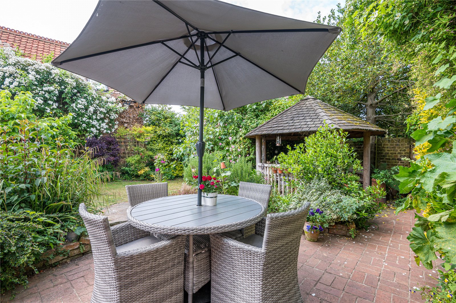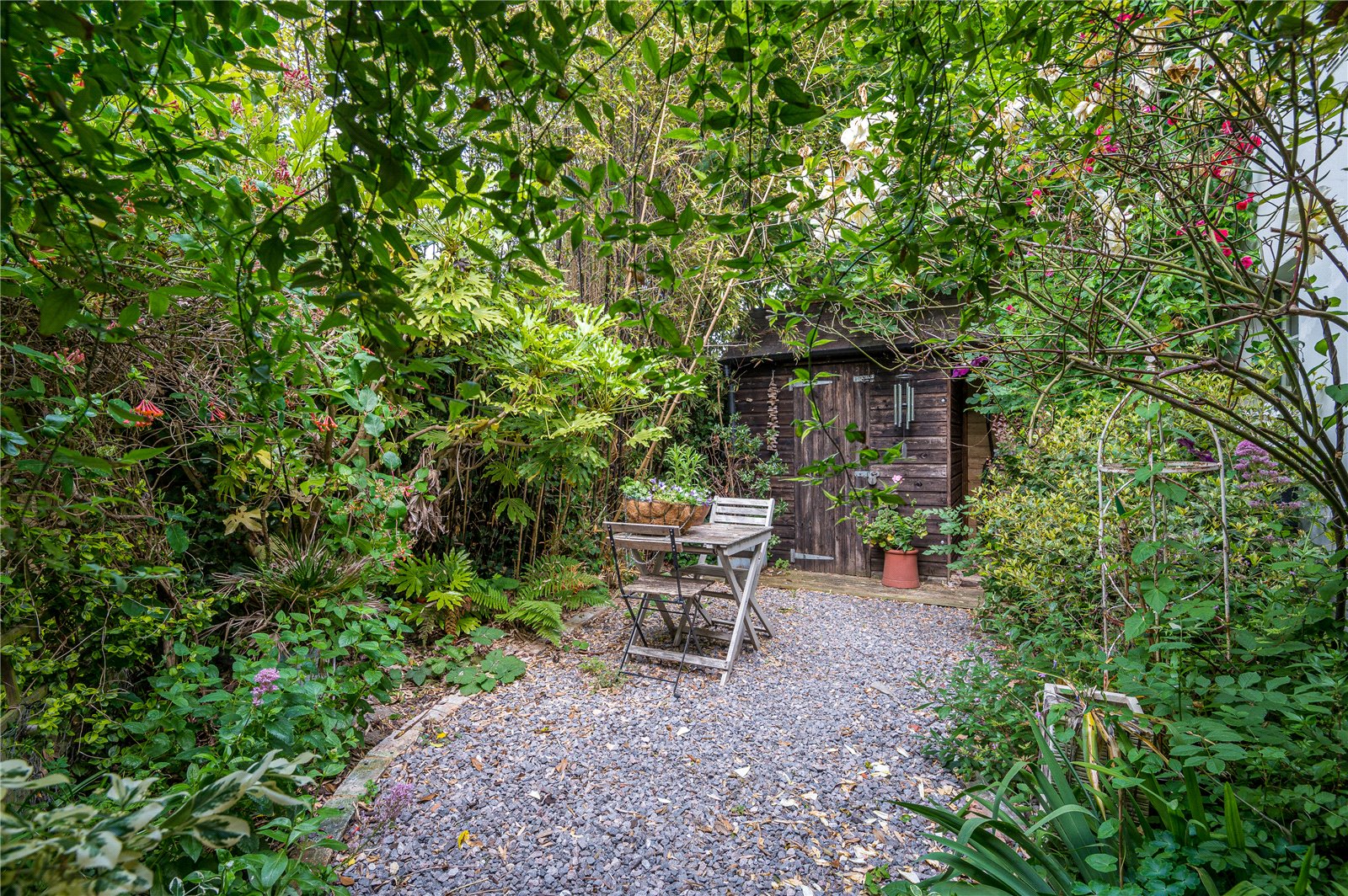 The professionally landscaped, mature rear garden can be approached from either the Utility Room or the Dining Area and enjoys a due southerly aspect. Victorian walled to all boundaries. Commencing with an extensive patio area, expanse of lawn with shaped, planted beds and borders. A variety of trees including Fig tree, Quince tree, Mulberry and cherry tree. Various outbuildings and a superb dining rondavel/pavilion. Original existing Well and pump. Secure gated side access. Outside lighting. To the rear of the garden is an enclosed courtyard area (attributed to and used by the studio/annexe) and an external iron staircase leading to the first floor.