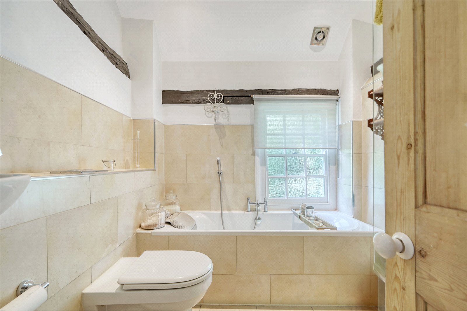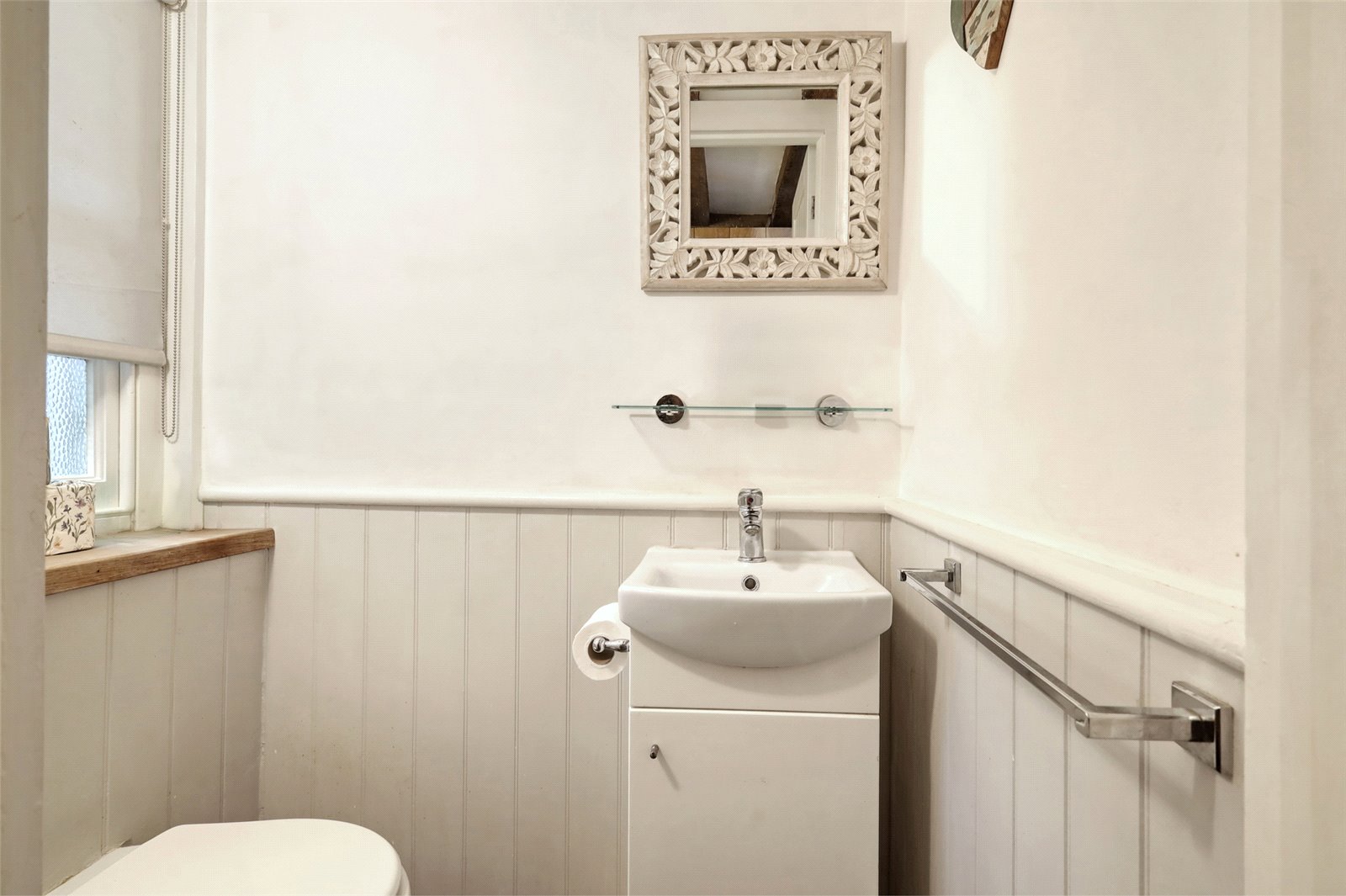 Obscure glazed sash window to side. Fitted with a wash basin and integrated cistern WC. Wall panelling, exposed beams, wall light point.