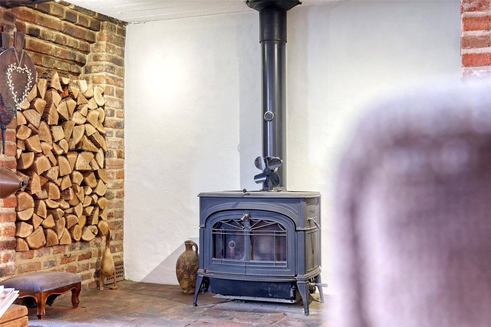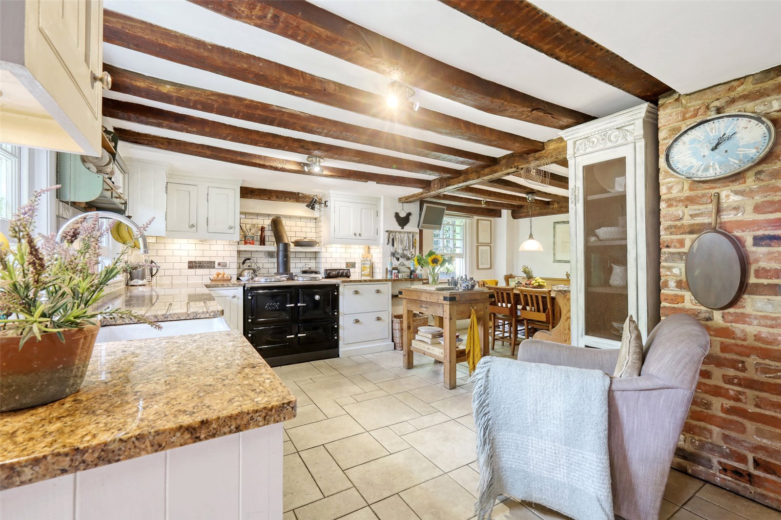 Two sash windows to rear, one sash window to side. A professionally planned and installed bespoke 'hand painted in frame' Shaker style country kitchen with solid granite surfaces and inset Butler sink. 'Esse' hybrid wood fired and electric range cooker with twin ovens. Integrated dishwasher. Tiled flooring, bespoke corner church pew banquette seating with space for refectory table. Travertine style miniature metro tiled splashbacks. Exposed studwork and beams. Recessed LED lighting.