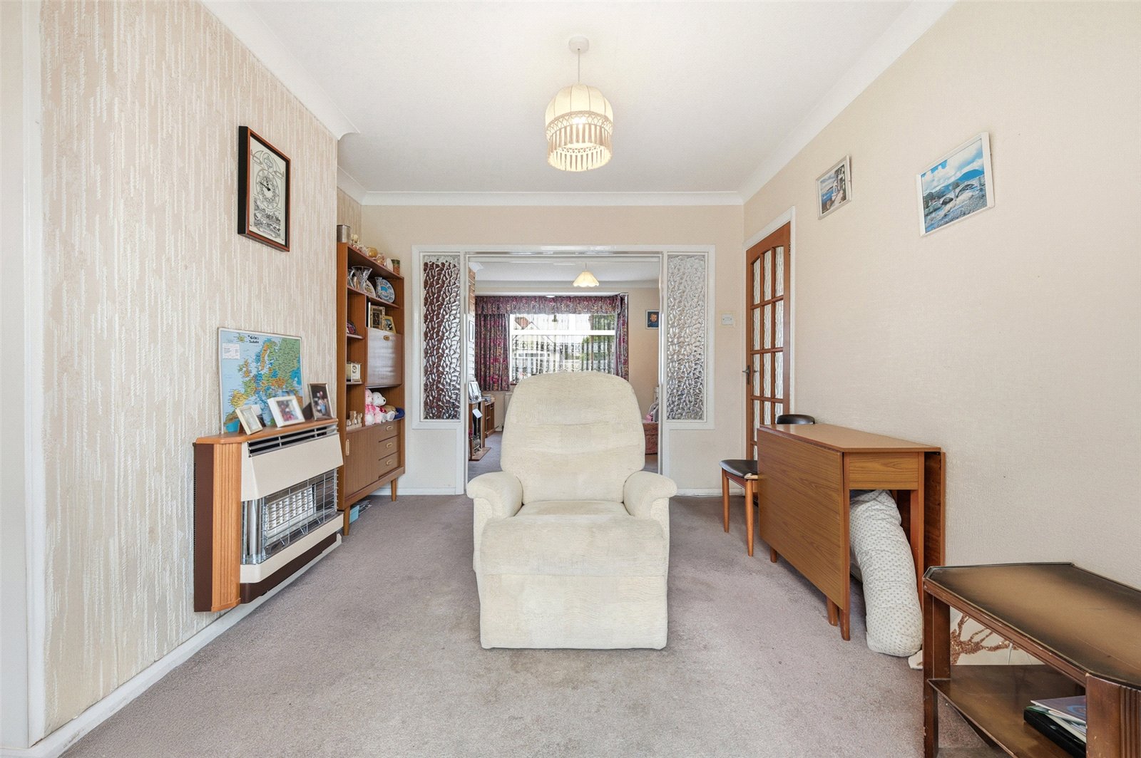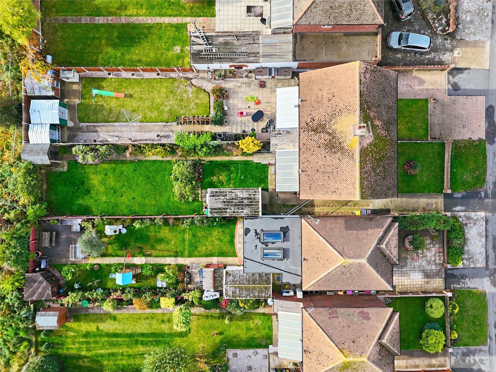 The front of the property is laid to lawn with central flower bed. Private driveway to side leading to detached garage.