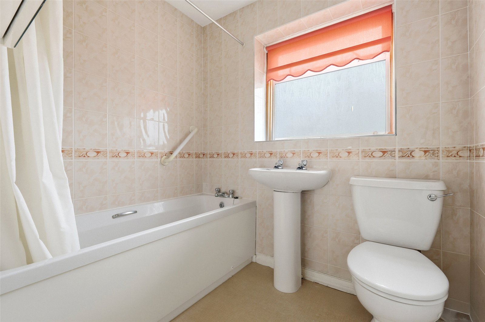 Obscure Upvc double glazed window to rear. Fitted with a three-piece white suite comprising bath, wash handbasin and WC. Tiled walls.