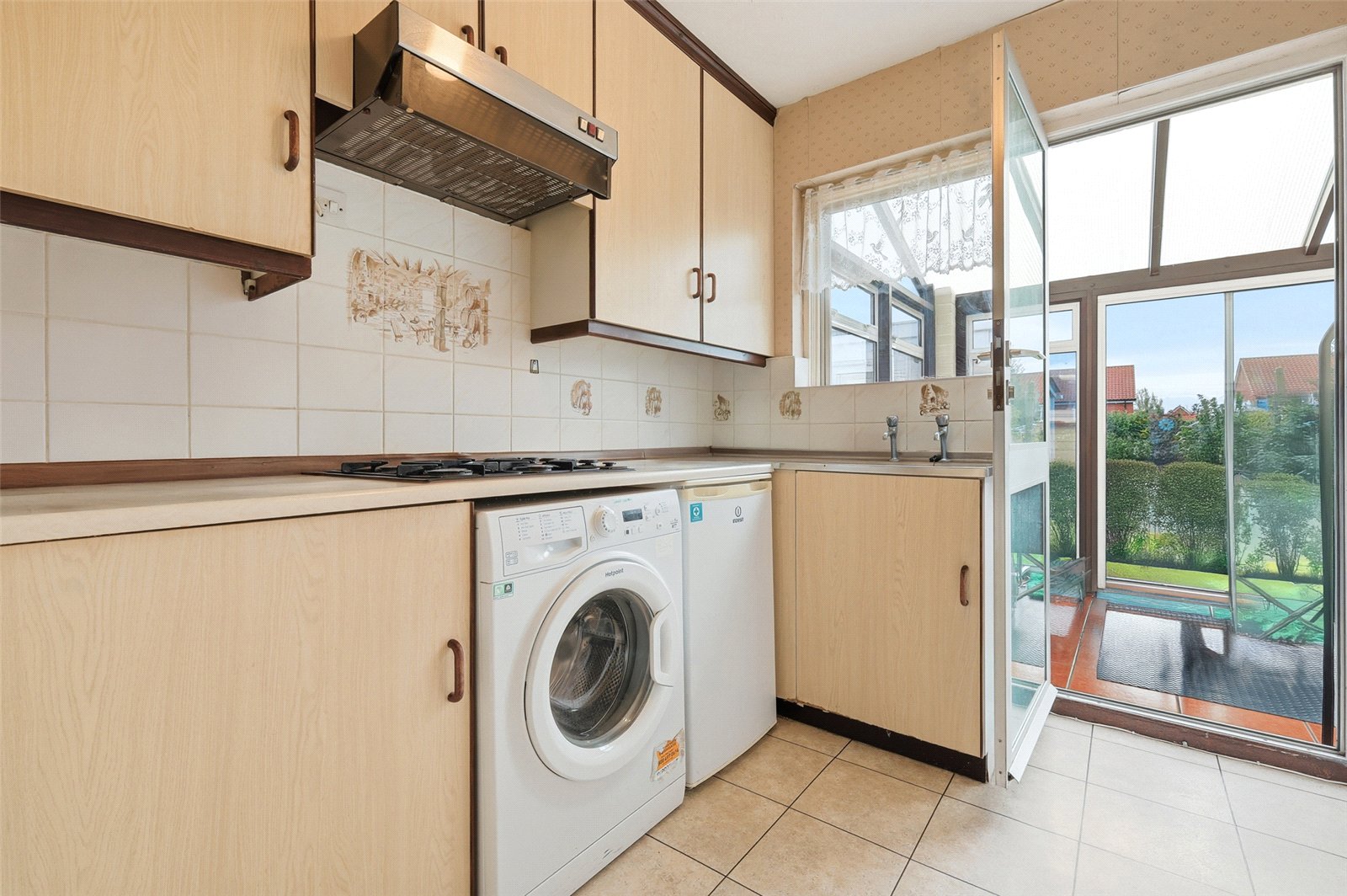 The Kitchen is fitted with a range of base and pelmeted eye level cabinets with rolled edged working surfaces and inset stainless steel sink unit. Tiling to splashback areas. Eye level electric cooker. Space for fridge. Space, plumbing and drainage for washing machine. Hob with cooker hood above. Window and glazed door leading to Conservatory.